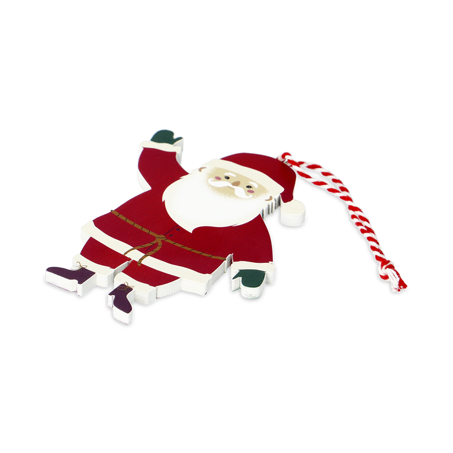 にこやかな表情のサンタが印象的な、木製のハンギングオーナメント。赤いスーツと白いひげ、手を振るポーズがなんとも愛らしく、ツリーや棚のデコレーションにぴったりです。ウッド素材で、サイズは0.5×10×8.2cm。ストライプの紐付きで、ツリーやガーランドなどに手軽に飾れます。落ち着いた色づかいと温かみのある表情が、空間にほっとする季節の彩りを添えてくれます。