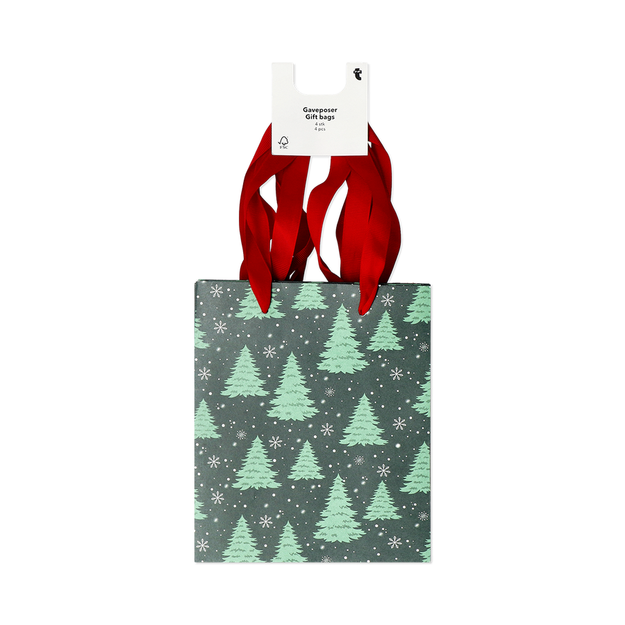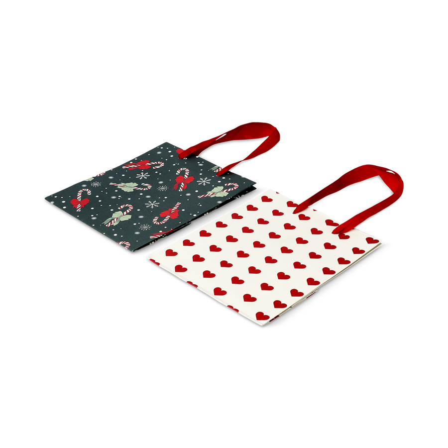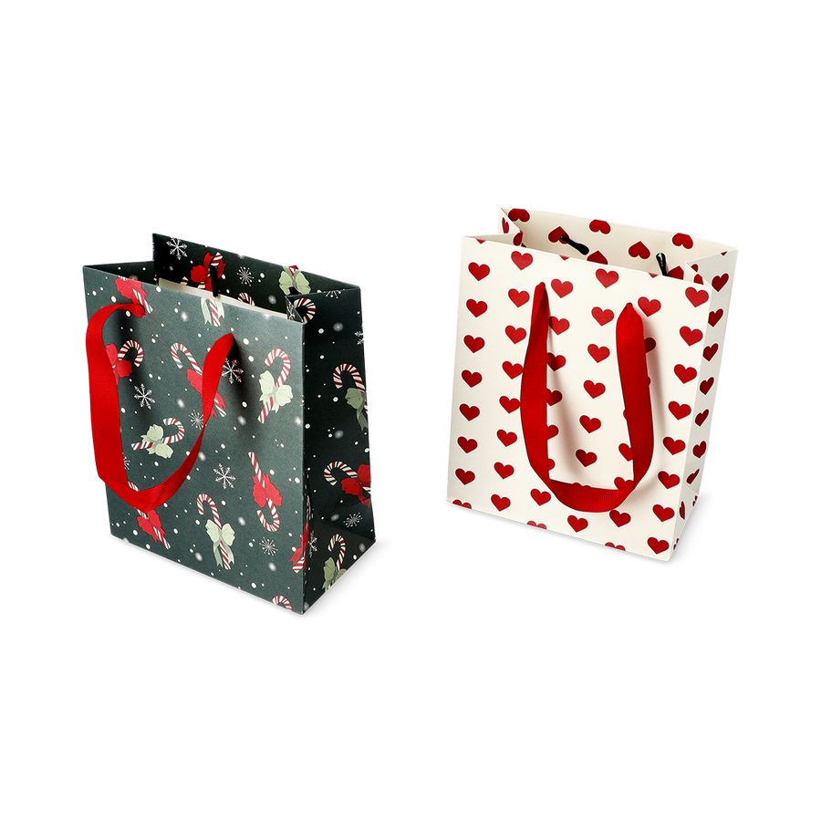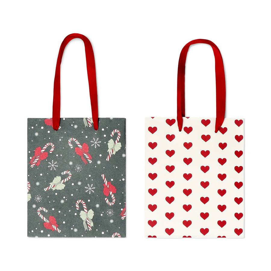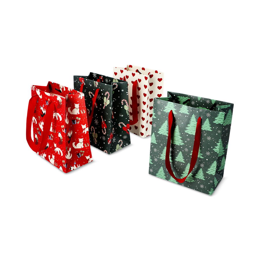 クラシックなクリスマス柄が楽しめるギフトバッグ4枚セット。ツリーやハートなどの多色デザインが揃い、サイズは8×18×15cm。お菓子や雑貨、プチギフトの包装にぴったりです。紙製で、赤いハンドルが季節のアクセントに。ラッピングペーパーやテープいらずで、手軽にかわいく包める便利なアイテム。忙しいXmasシーズンにもGoodなギフトバッグです。
