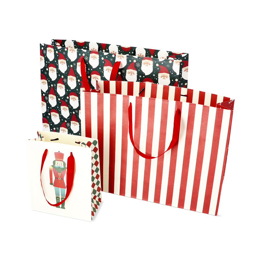 3サイズがセットになった、便利でスタイリッシュなクリスマスギフトバッグ3枚セット。最大サイズは12×30×45cmで、大きなプレゼントにも対応。ほかの2枚は小物にぴったりなサイズです。ナッツクラッカーやサンタ、ストライプなどの華やかな柄が揃い、紙製で赤いハンドル付き。統一感のあるラッピングが楽しめる、見た目にも楽しいギフトセットです。