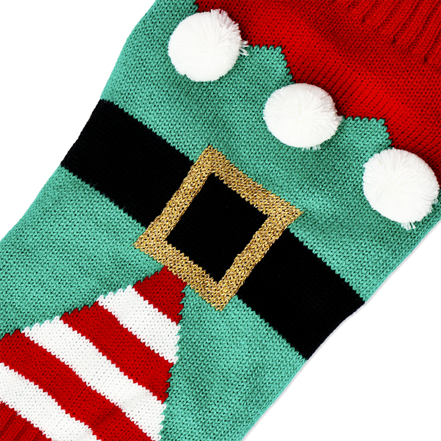 赤・緑・白の組み合わせにポンポンとベルトプリントが映える、遊び心満点のデザインです。