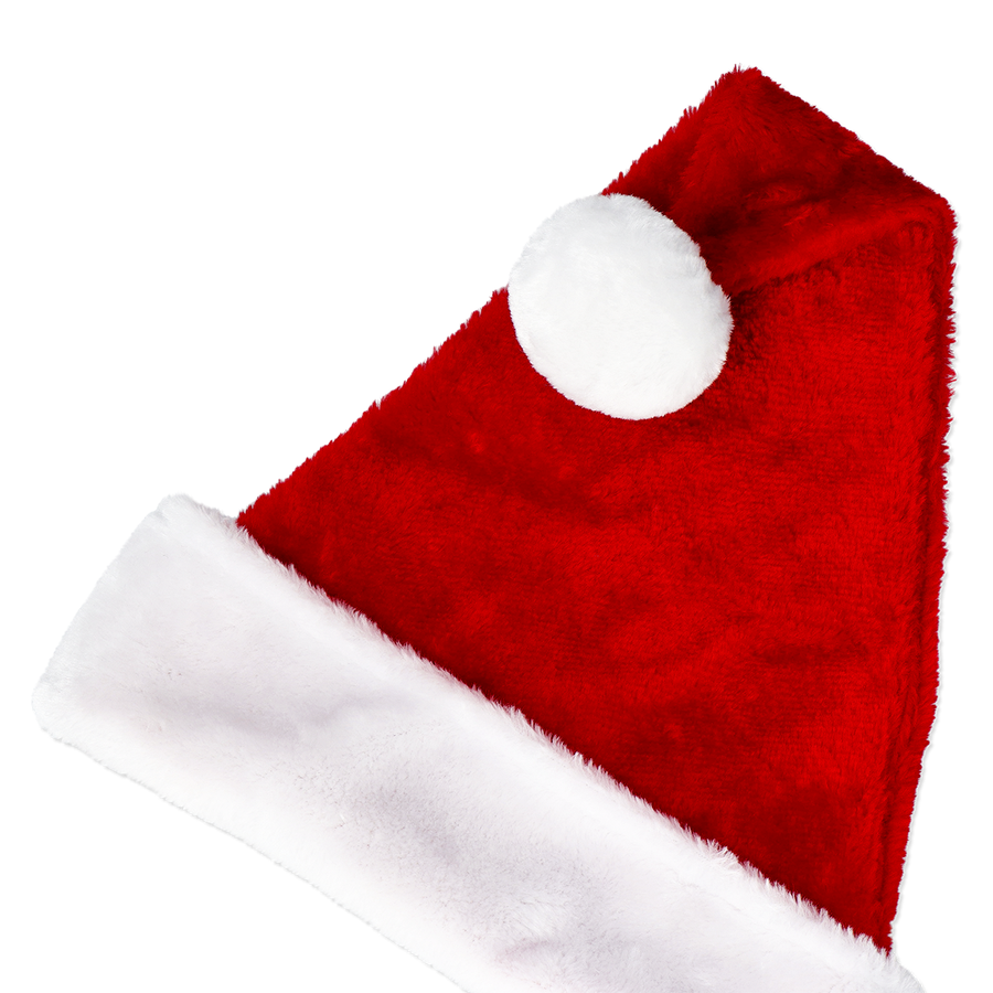赤いベルベット素材に白いトリムとふわふわのポンポンが付いた、シンプルながら存在感のあるデザインです。