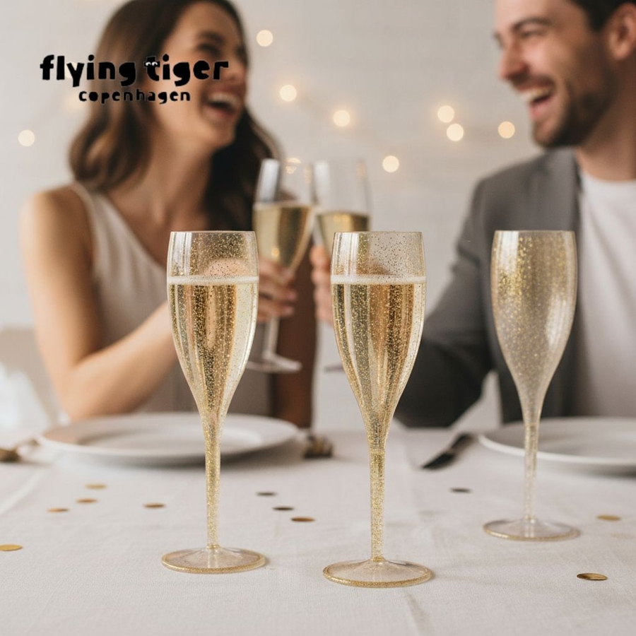 きらめくゴールドのグリッター仕上げが施されたこれらのフルートは、再利用可能なプラスチック製で、食品に対応しています。