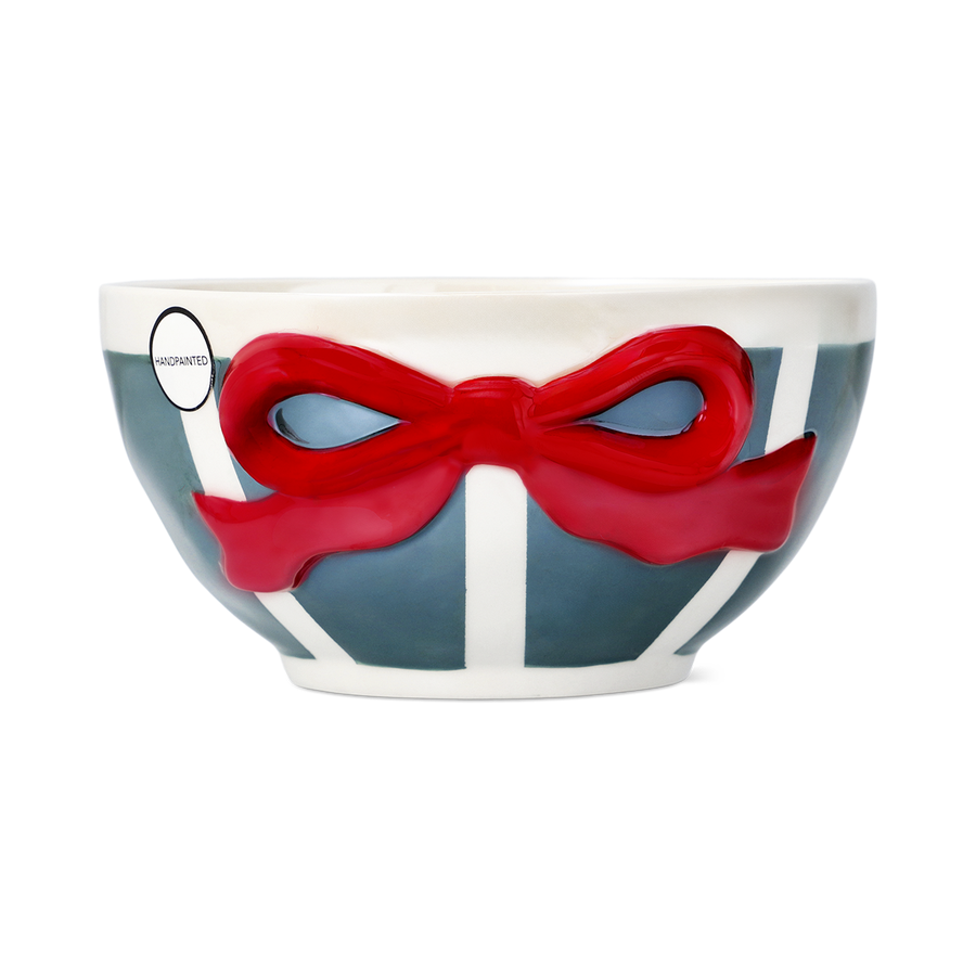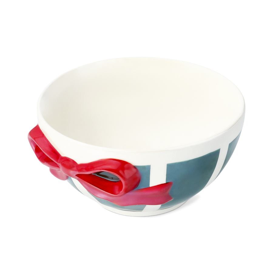 赤と緑のストライプに立体的なリボン模様が映える、クリスマスらしいセラミックボウル。