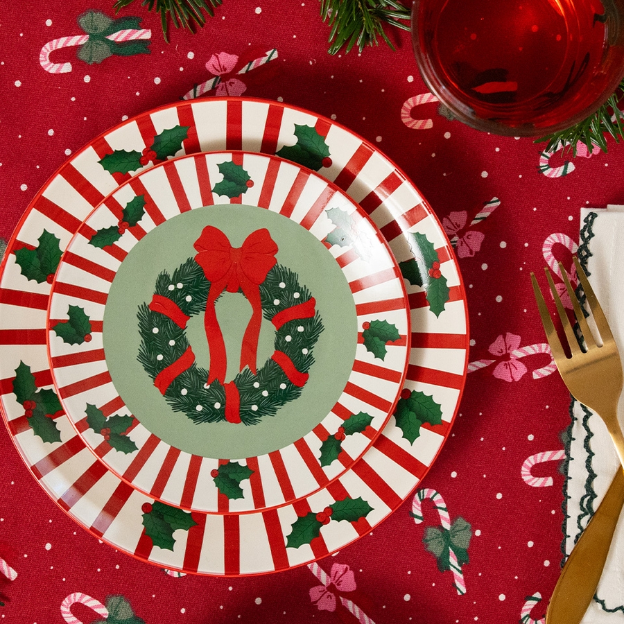 リースと赤いリボンの多色プリントが cheerful な雰囲気を添えます。