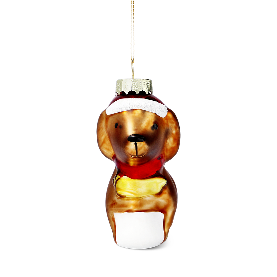 サンタ帽をかぶったダックスフンドがモチーフのガラスオーナメント。