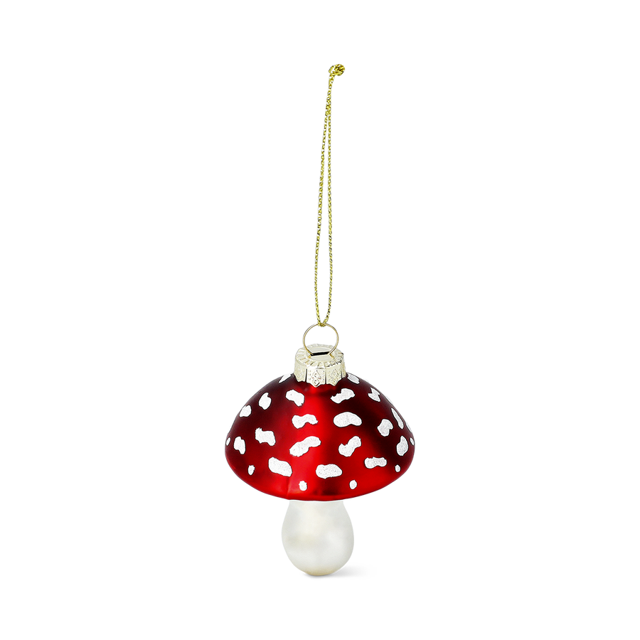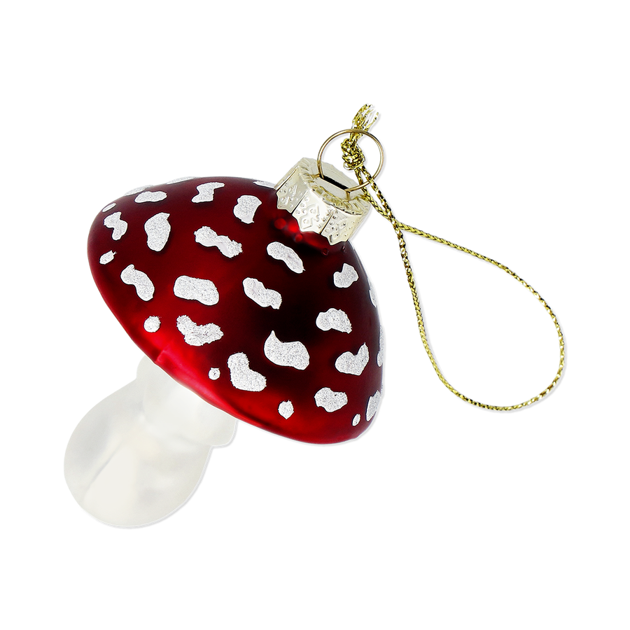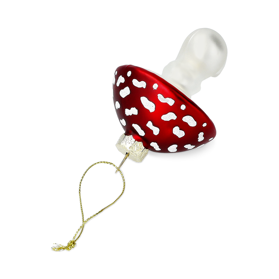 赤と白の水玉模様が目を引く、マッシュルーム型のガラスオーナメント。