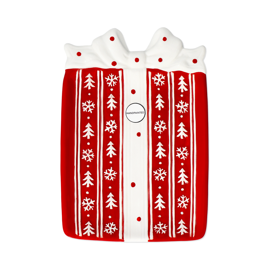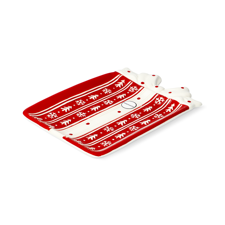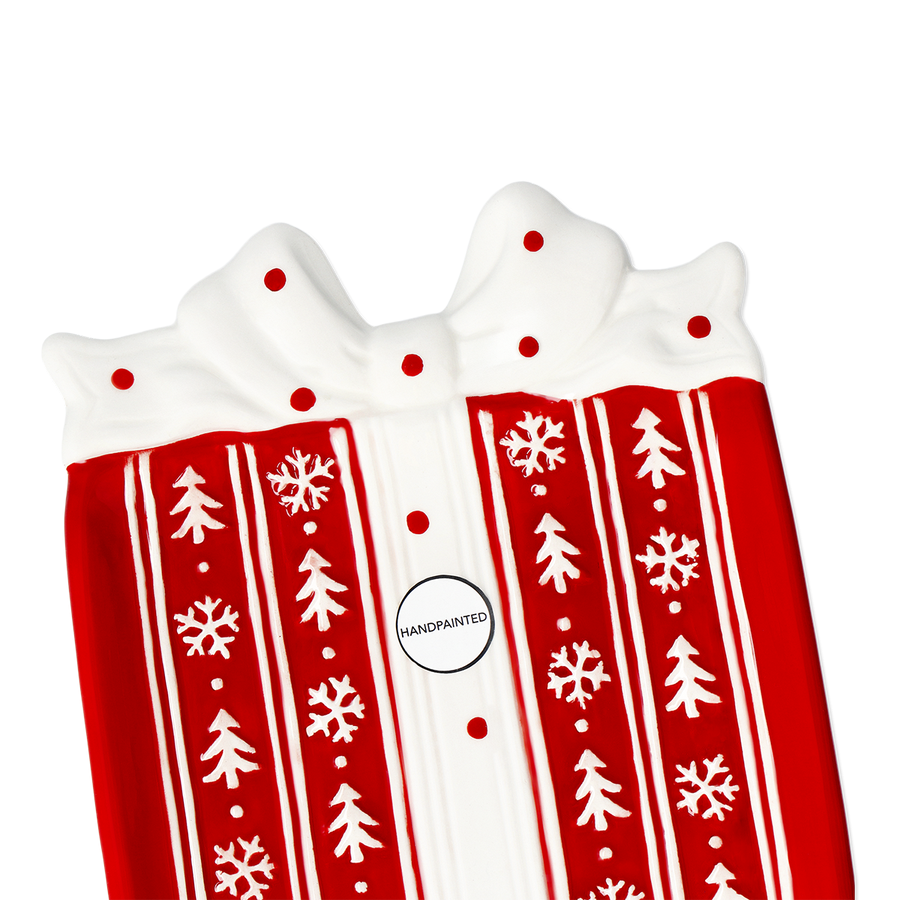 赤と白のクリスマスパターンと立体的なリボンが華やかで、テーブルを一瞬でホリデームードにしてくれます。