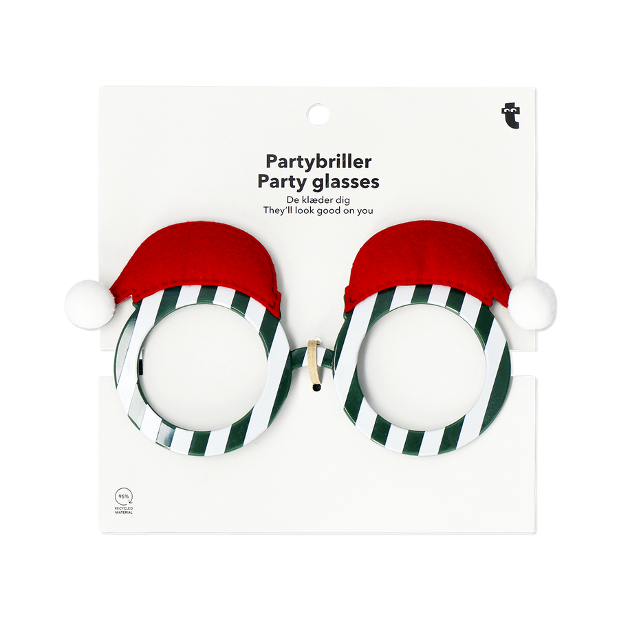グリーンとホワイトのストライプにサンタ帽をあしらった、にぎやかなパーティーグラス。
