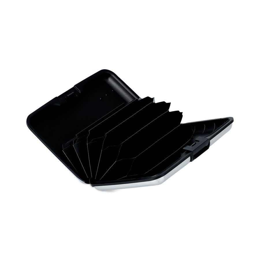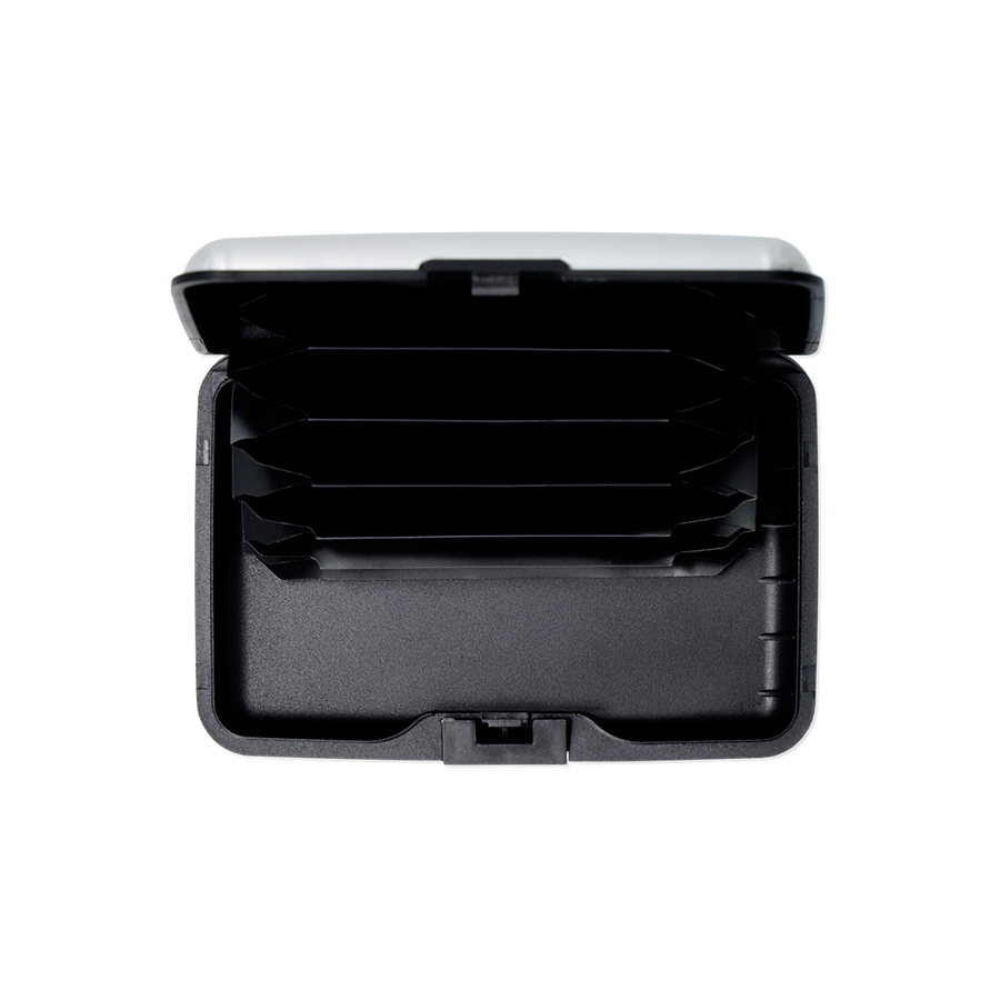 しっかりとした金属製シェルがカードの曲がりやキズを防ぎ、内側の仕切りで整理も簡単。