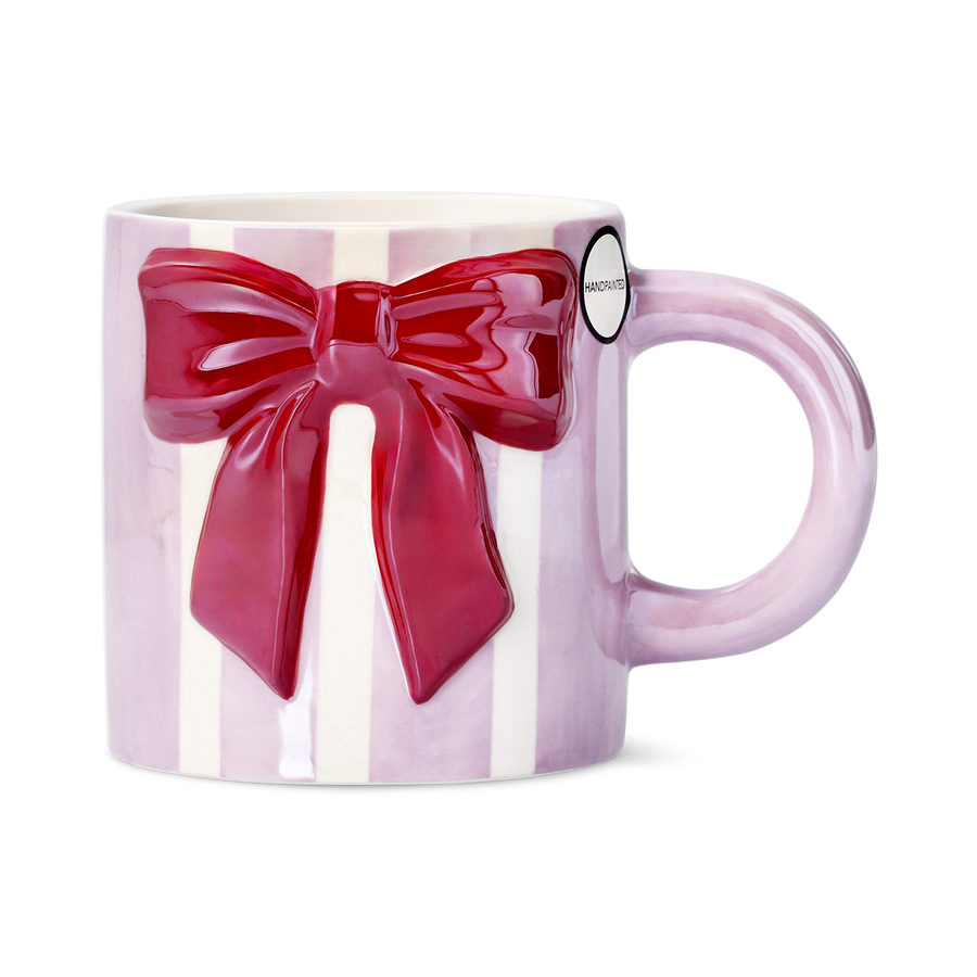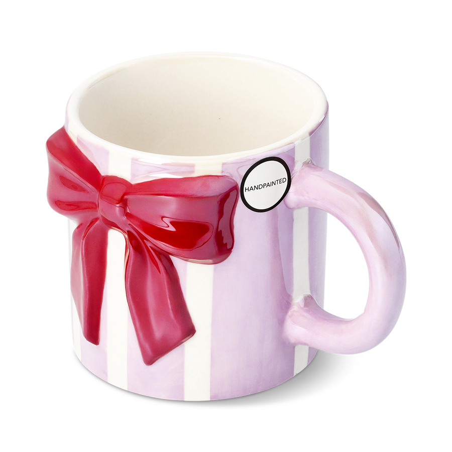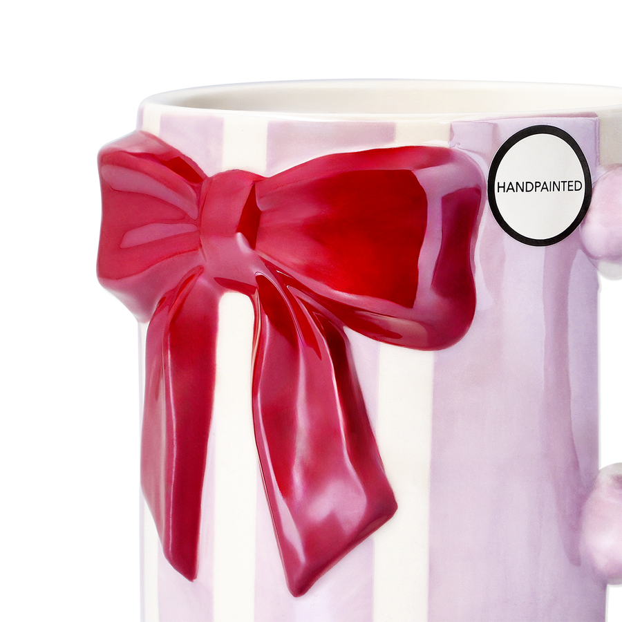ピンクとレッドのリボンが立体的にデザインされた、ストライプ柄のマグカップ。