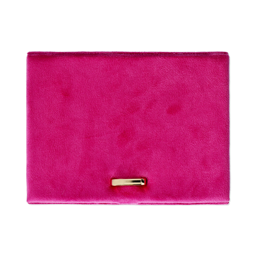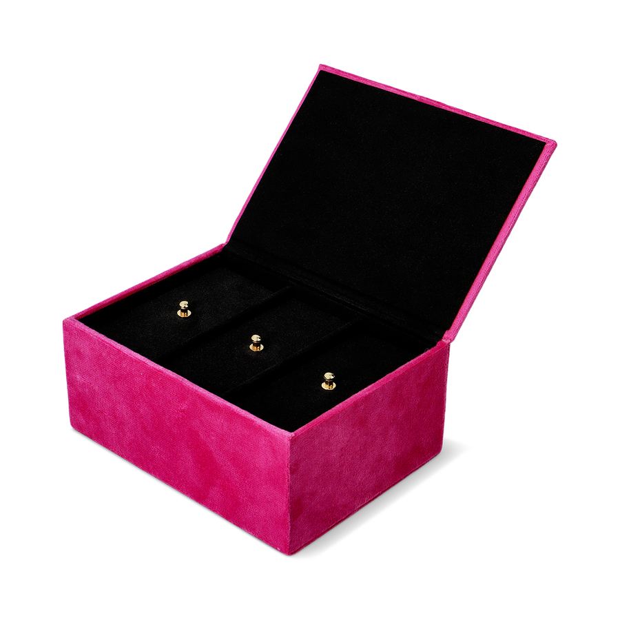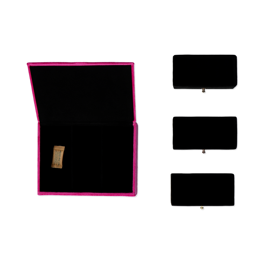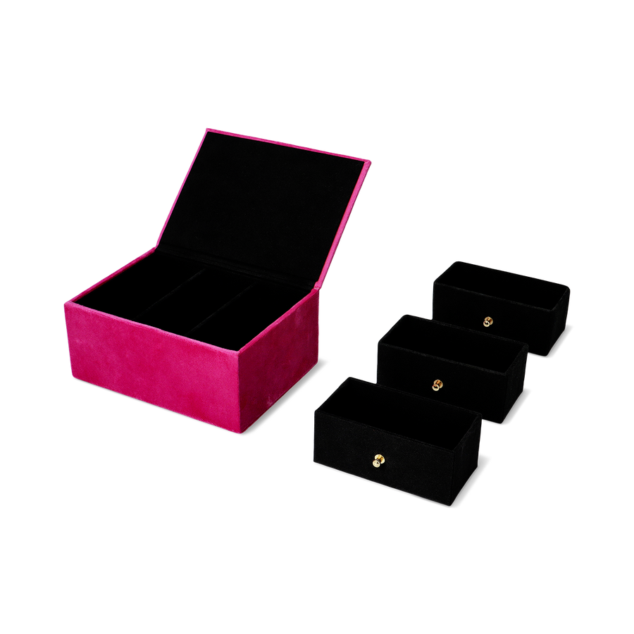 鮮やかなピンクの外側は柔らかな手触りで、内側のブラックがスタイリッシュなコントラストを生み出し、ジュエリーを美しく引き立てます。