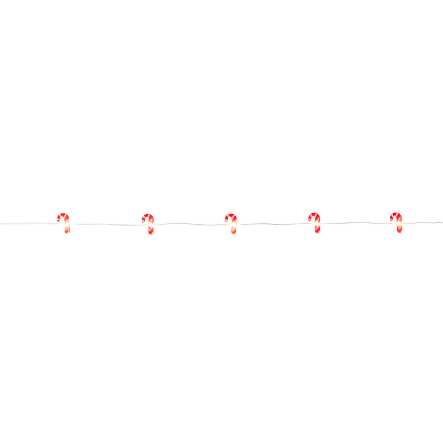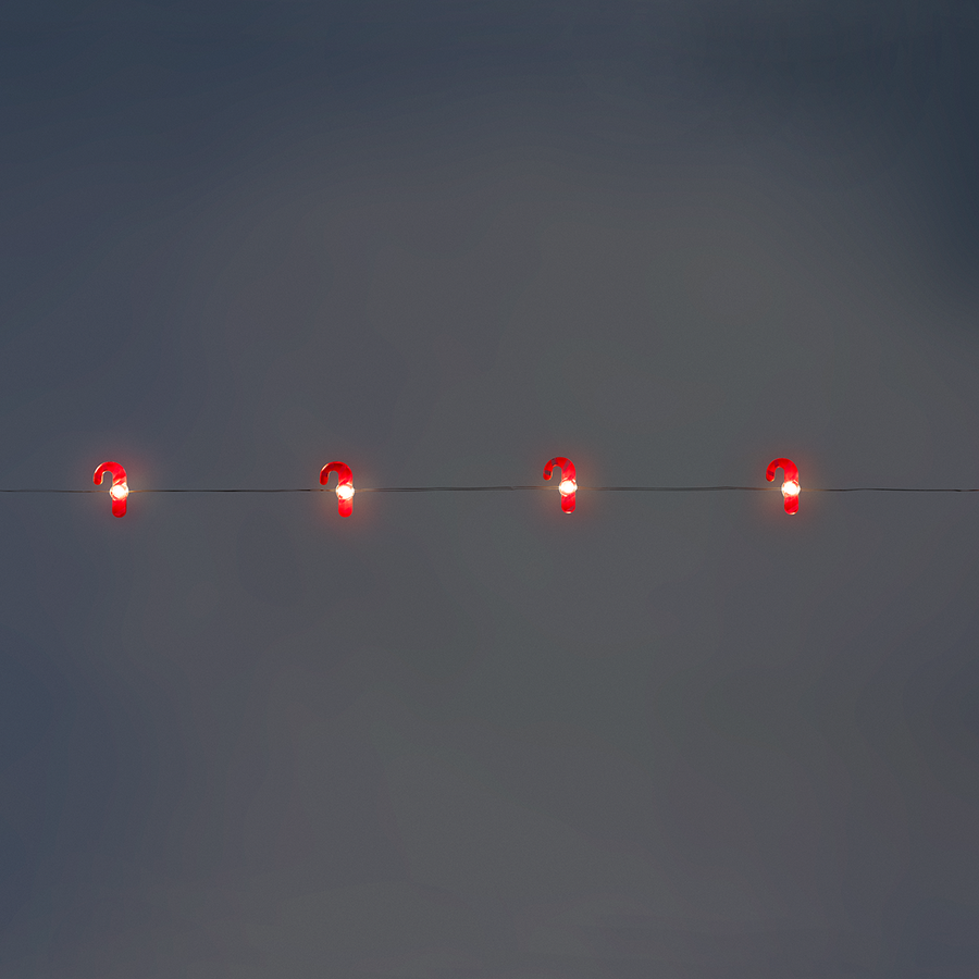赤と白のキャンディケインモチーフが並ぶ、遊び心たっぷりのライトチェーン。