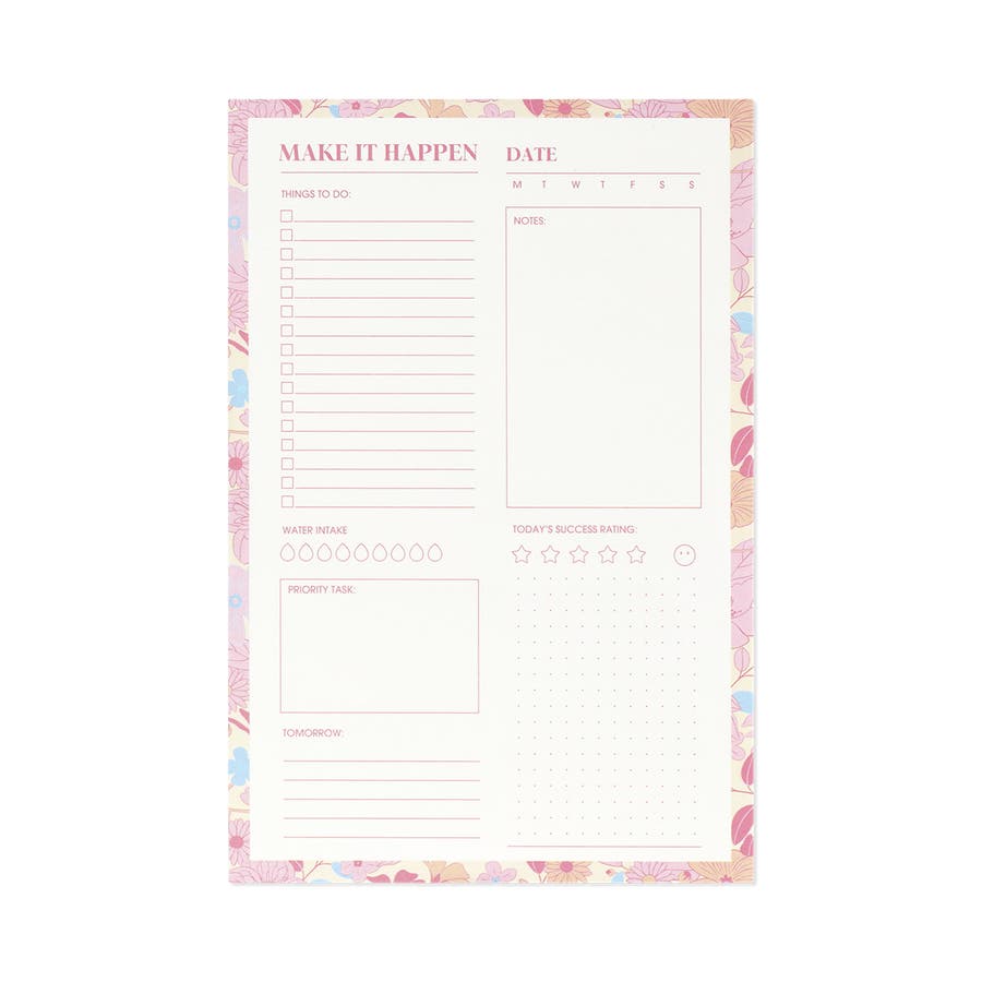 柔らかなピンクの花柄のボーダーがワークスペースに明るい雰囲気を添え、タスク、優先事項、メモを簡単に計画するのに役立ちます。