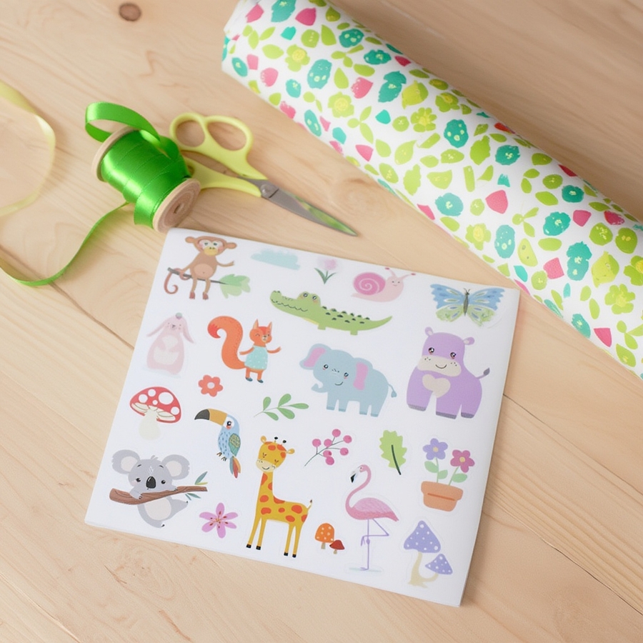 各ページには、想像力と創造力を刺激するかわいい生き物たちが描かれたキラキラ光る紙製のステッカーが配置され、ノート、手紙、個人的なプロジェクトの装飾に最適です。