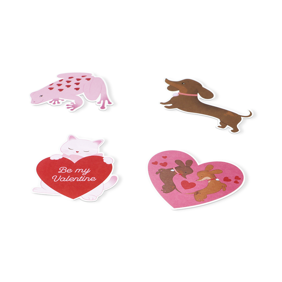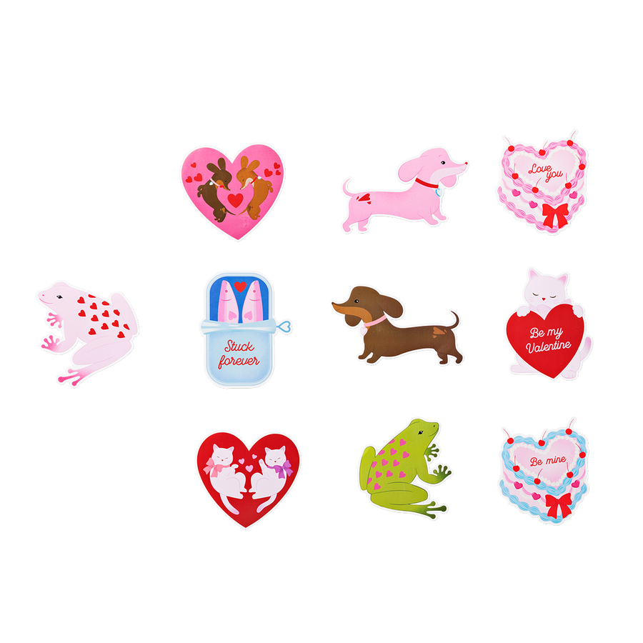 愛らしい動物からハート型まで、10種類のカラフルなバレンタインキャラクターが描かれています。
