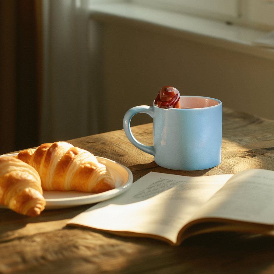 立体的なダックスフントがあしらわれたこの青いマグカップは、朝のルーティンに遊び心を加えてくれます。