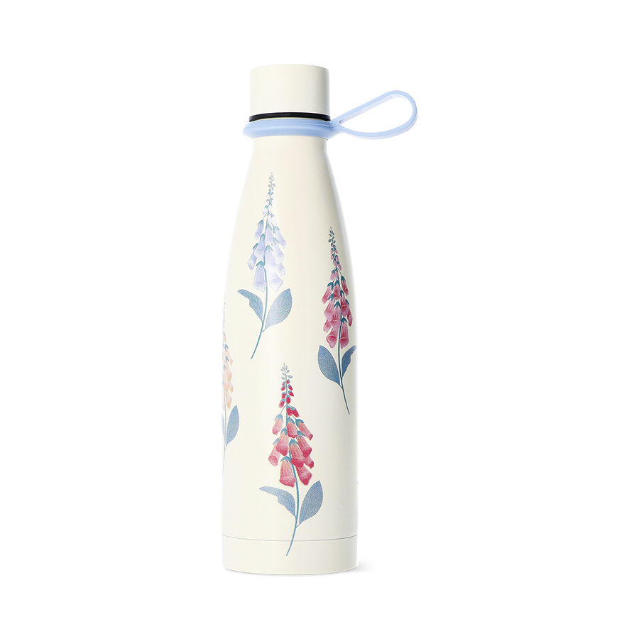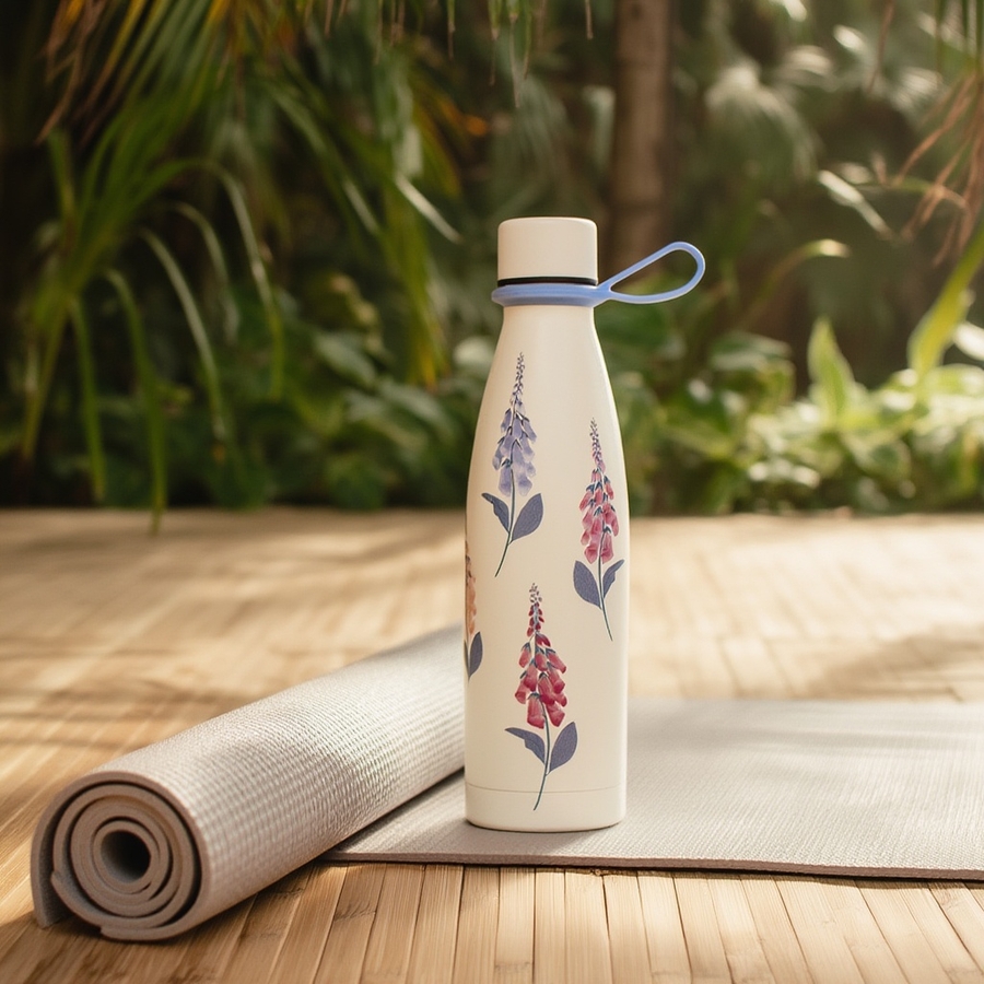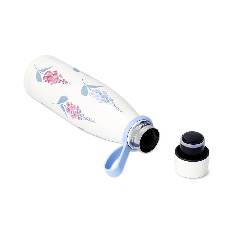 春を思わせる優雅なクリーム色のステンレス製ドリンクボトルに、チャーミングな花柄デザインを施しました。