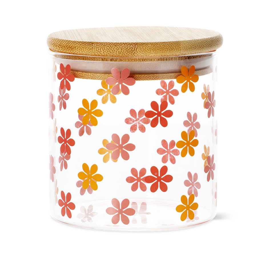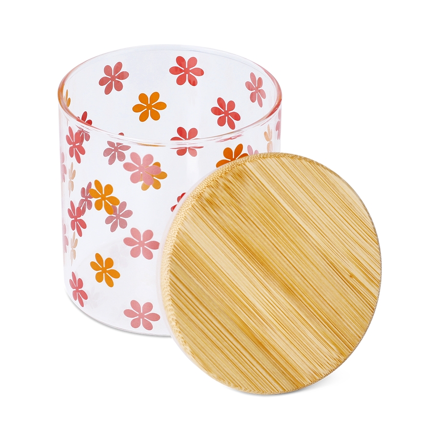 遊び心のある花柄と天然竹の蓋が特徴の、この小さなキャニスターでキッチンの棚を明るく彩りましょう。