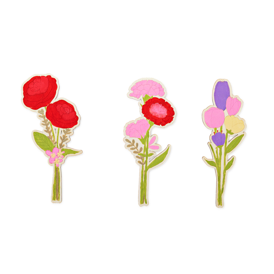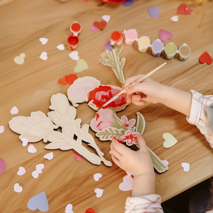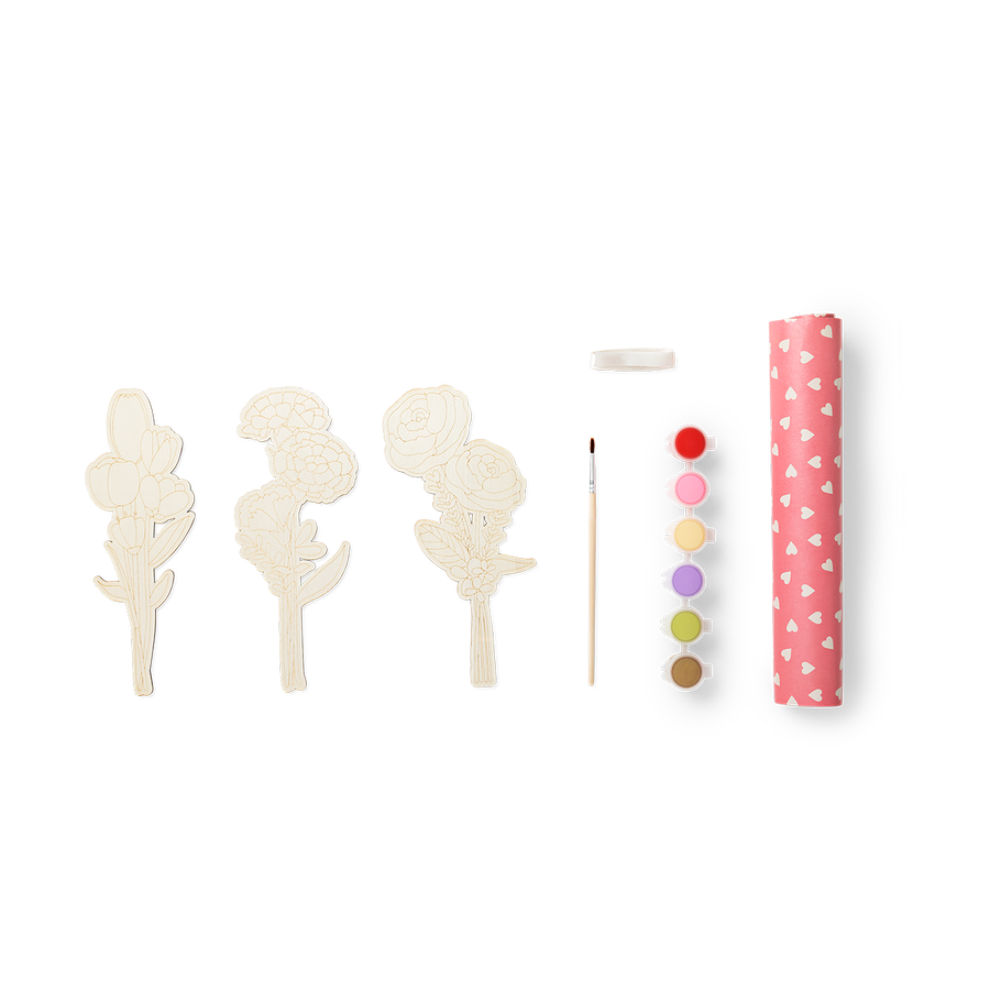 高さ約20cmの木製フラワー3本、5mlのアクリル絵具6本、木製の絵筆、21×21cmのクラフト紙3枚、ラッピング用のリボン1mが含まれています。