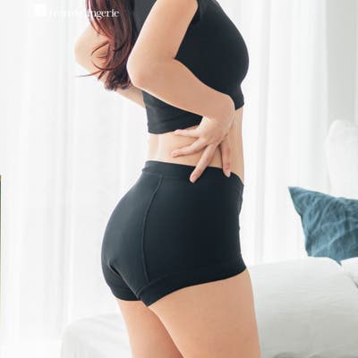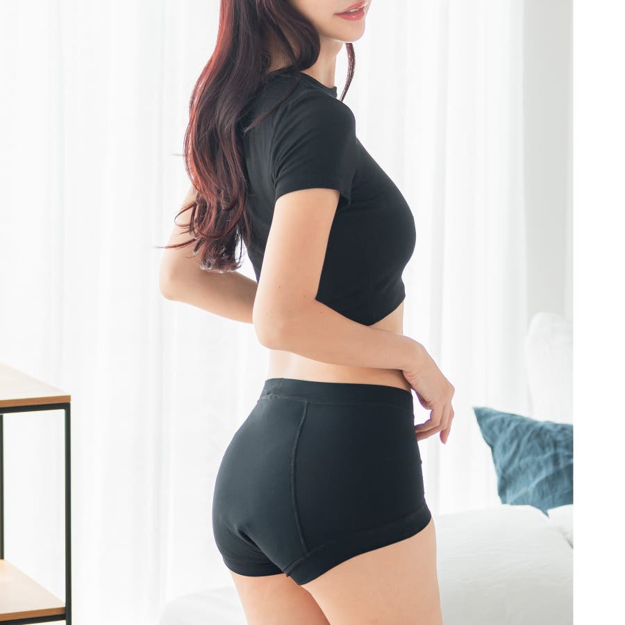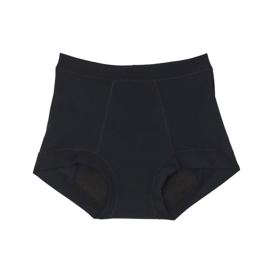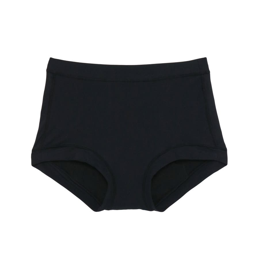 股上が深めでお尻もすっぽり隠れ、安心感の高い一枚。アクティブに動かないといけない時にもおすすめです。ウエストと足繰りは防水素材で折り返しにしていているので、漏れにくく、ゴムが直接肌に当たらず、締め付けの無い優しいフィット感。縫い目は凹凸の少ない平縫いにし、肌にストレスがかかりません。