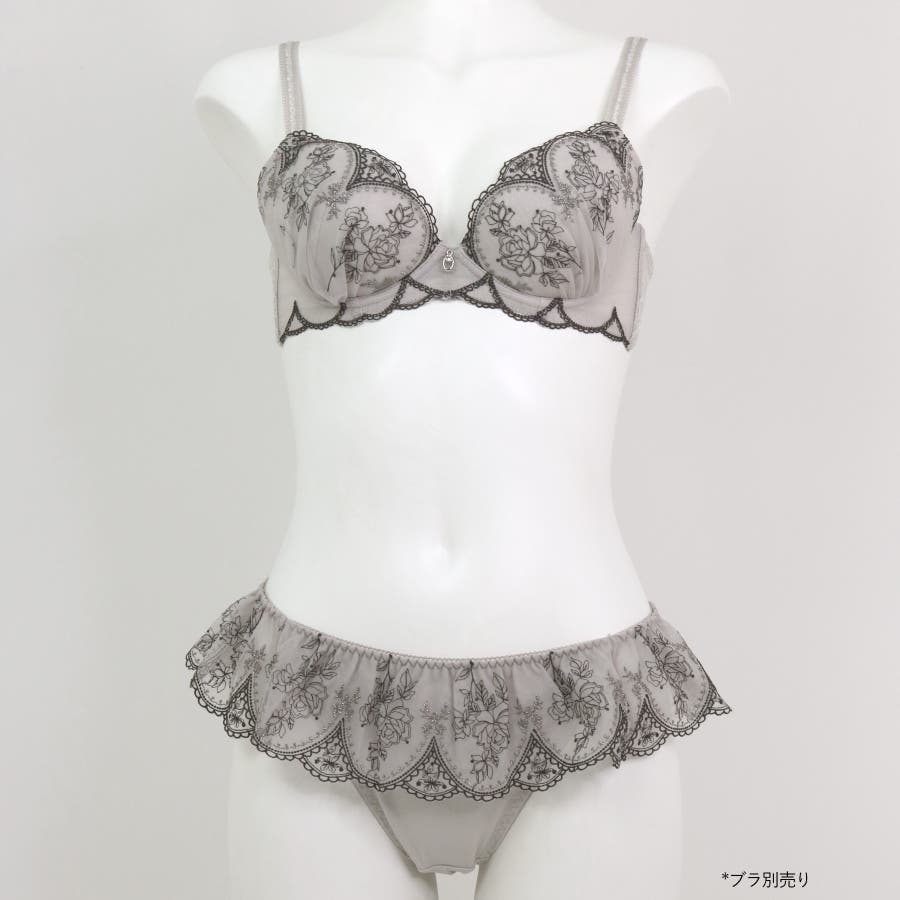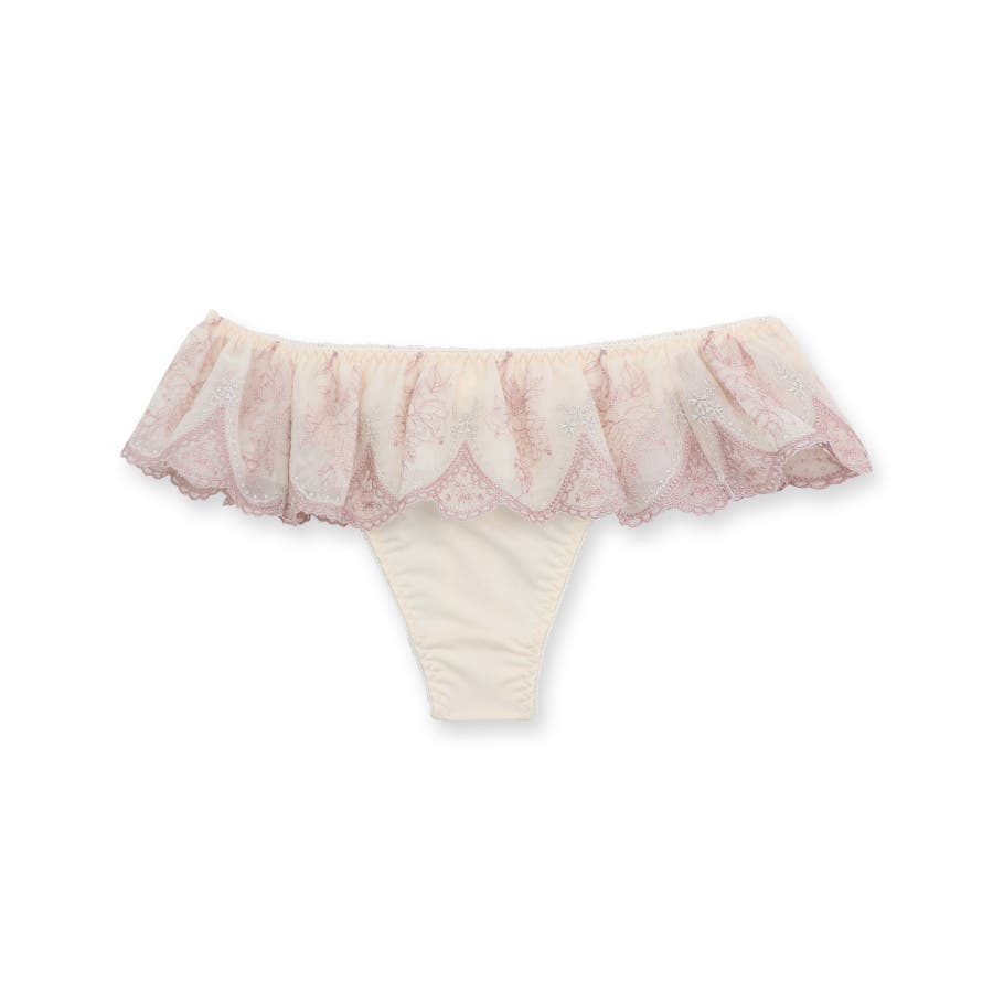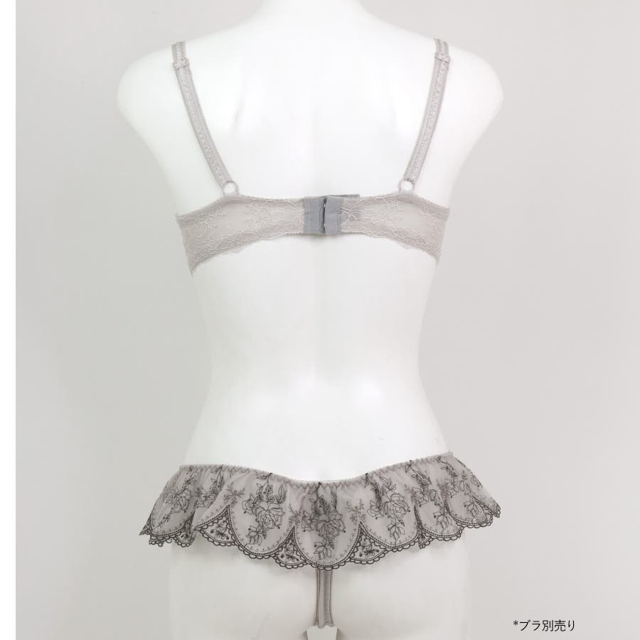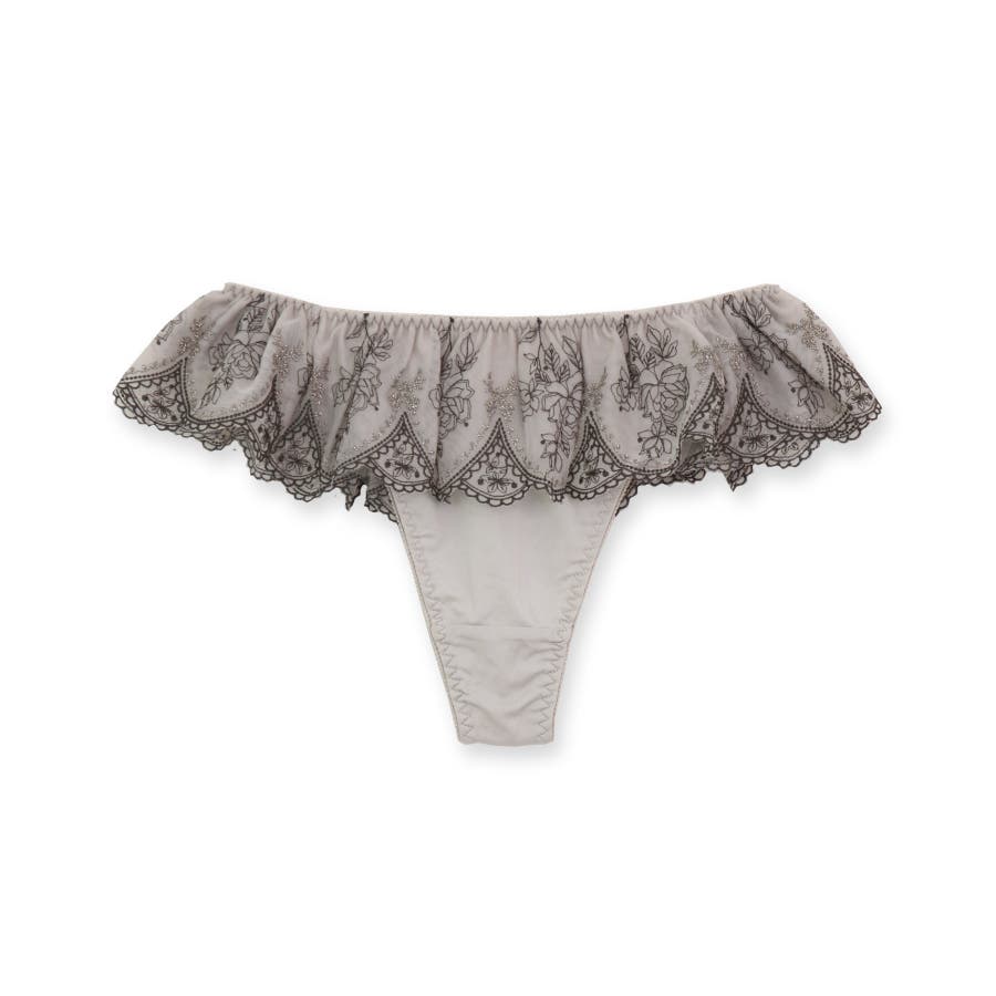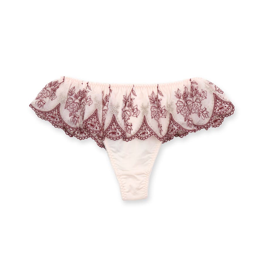 刺繍レースをたっぷり使ったフリルがウェストを一周するリュクスなデザインのTバックショーツ。ヒップラインを綺麗に見せるおしゃれアイテムの必需品。