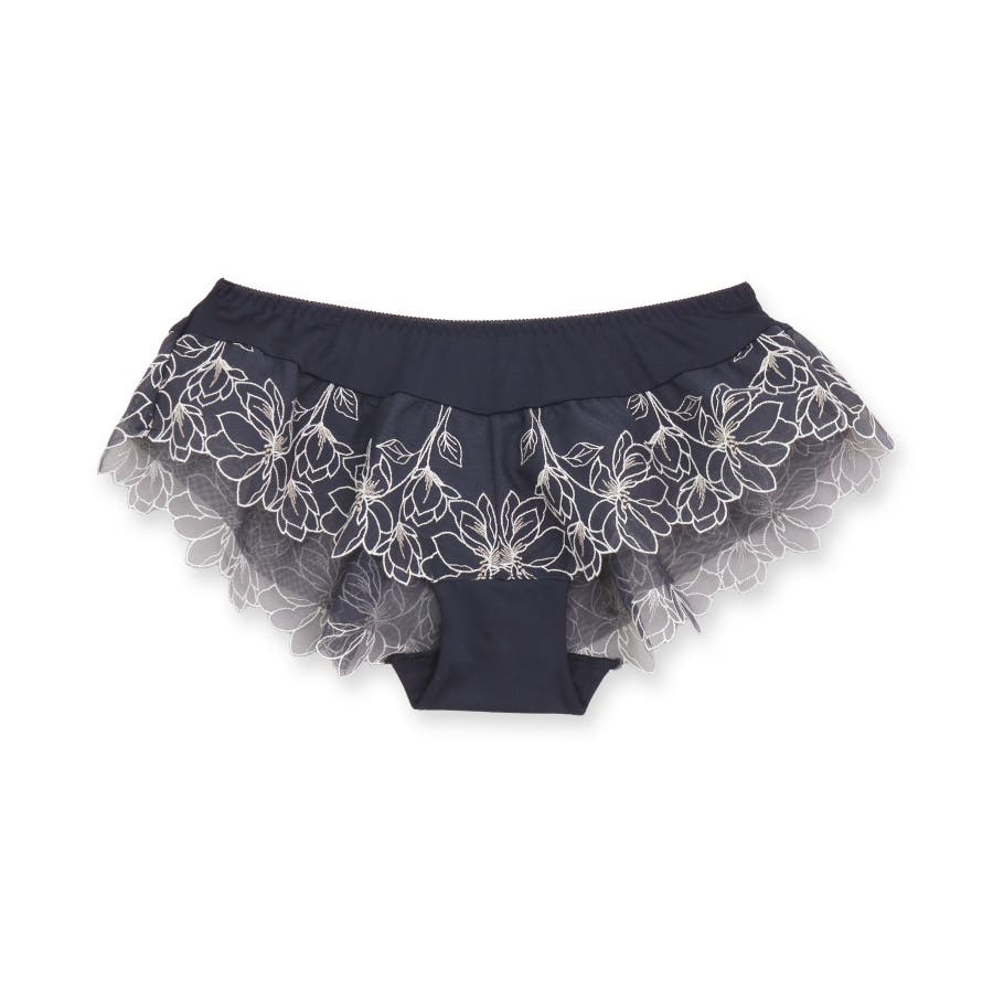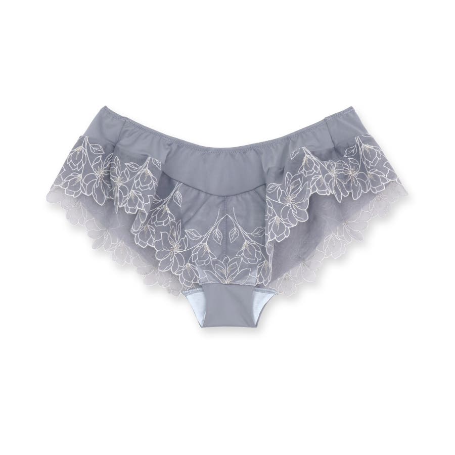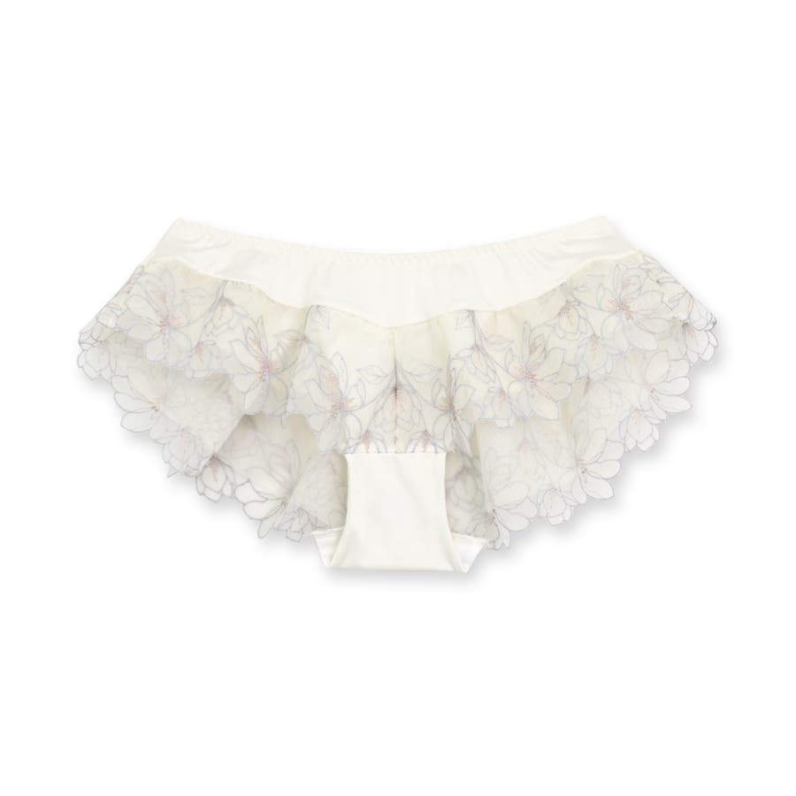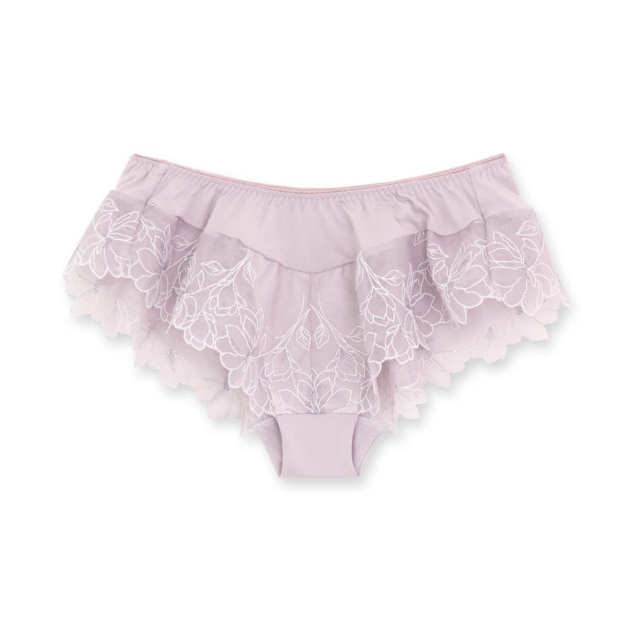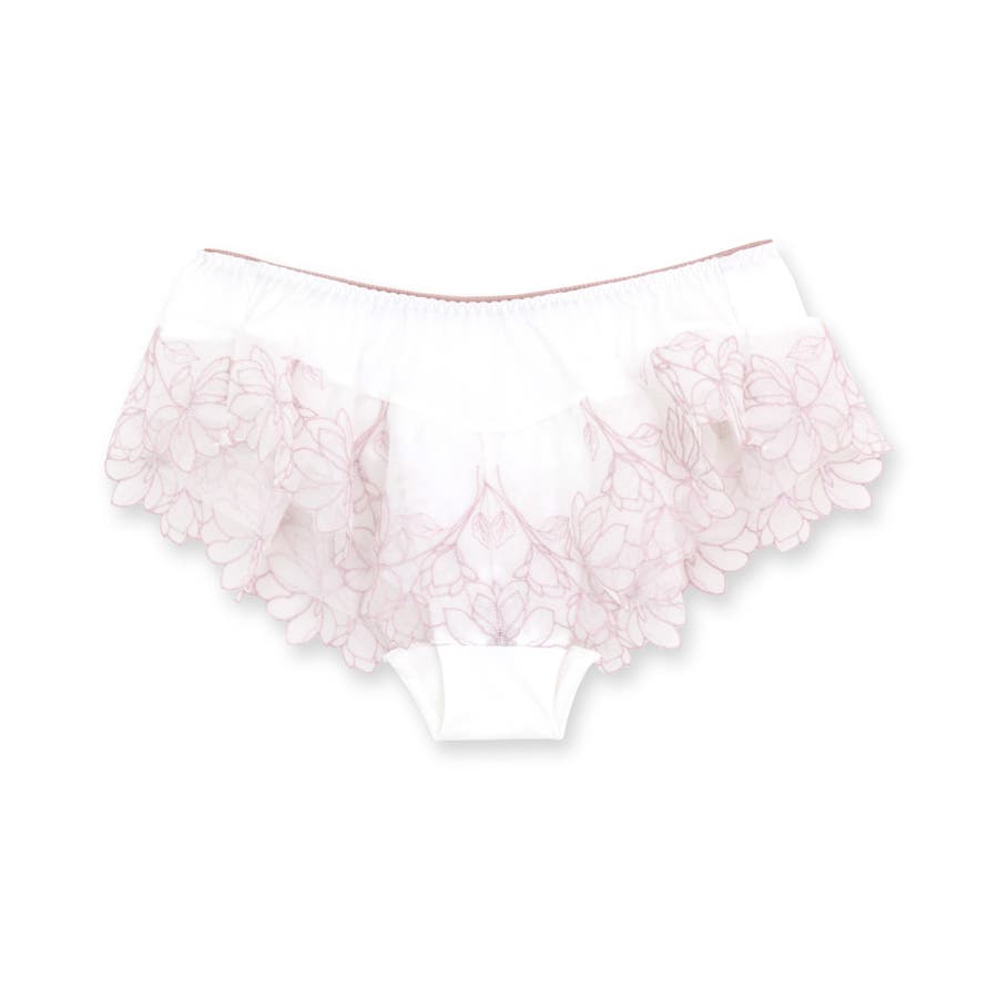 刺繍レースを贅沢に使用した360度可愛いフリルショーツ。足ぐりにゴムが入っていないので着心地も楽ちん。サイドの刺繍レースの裏にはチュールを重ね、肌にラメ糸が当たりにくいように工夫されています。ショーツのマチ裏には綿100%の綿天竺を使用し、素肌に優しい仕様になっています。
