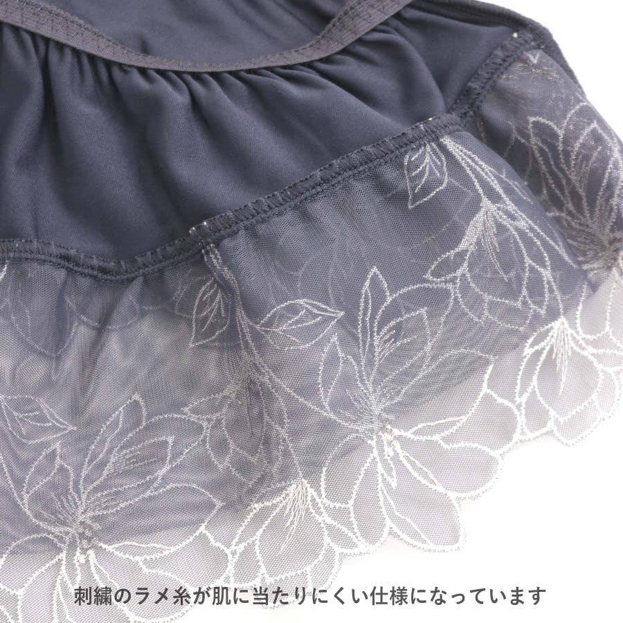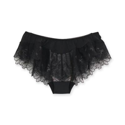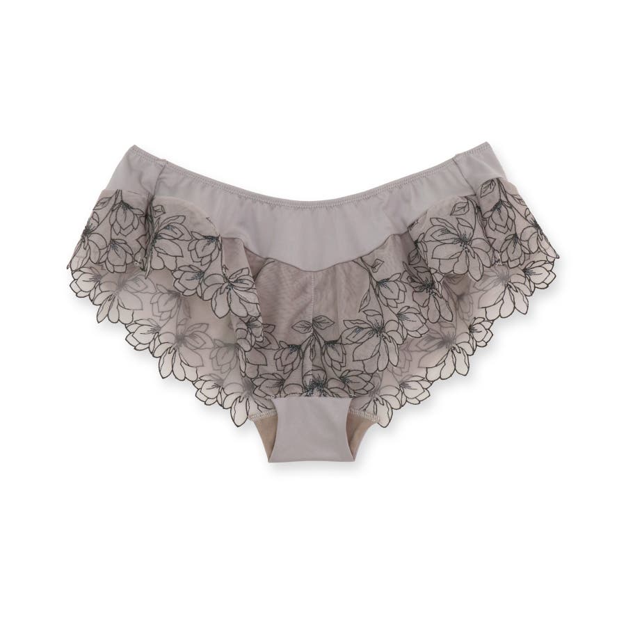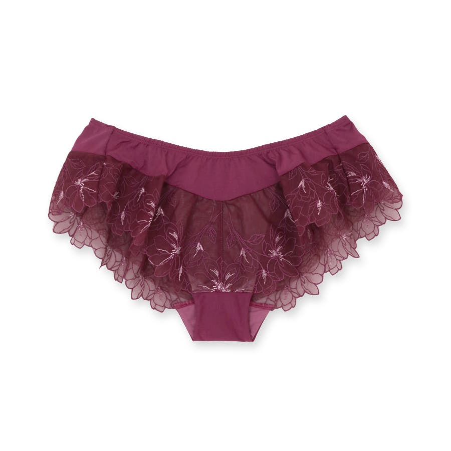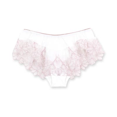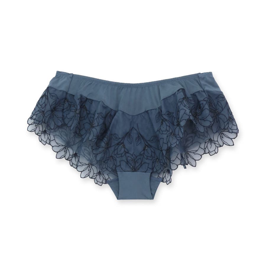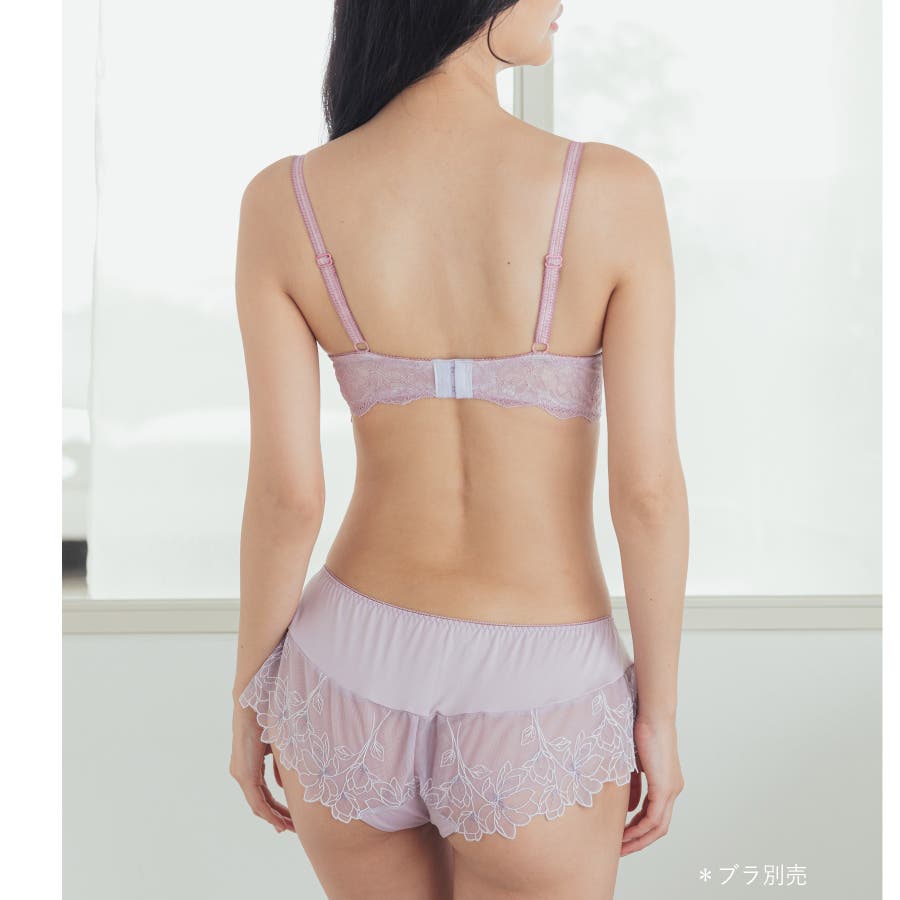 刺繍レースを贅沢に使用した360度可愛いフリルショーツ。足ぐりにゴムが入っていないので着心地も楽ちん。サイドの刺繍レースの裏にはチュールを重ね、肌にラメ糸が当たりにくいように工夫されています。ショーツのマチ裏には綿100%の綿天竺を使用し、素肌に優しい仕様になっています。