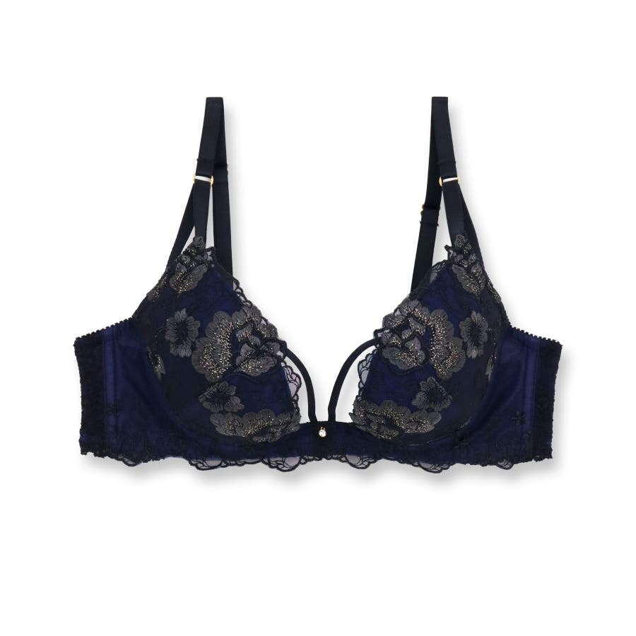 ワイヤーが当たりやすい人も安心の前中心が低めのL字ワイヤーは肉質が硬めでデコルテにボリュームができにくい人も谷間ができやすいのが嬉しいポイント。生地を継いだ薄いカップですが、取り外し可能なパッドが二箇所に付いているWパッドなのでお好みでボリュームの調整が可能。バストメイクをキープするリフトパネルやサーキットストラップ、段差防止の上辺ゴムのないアンダーベルトとキレイを作る機能が盛りだくさんのブラです。カップの中央をカットした大胆なブラ。
