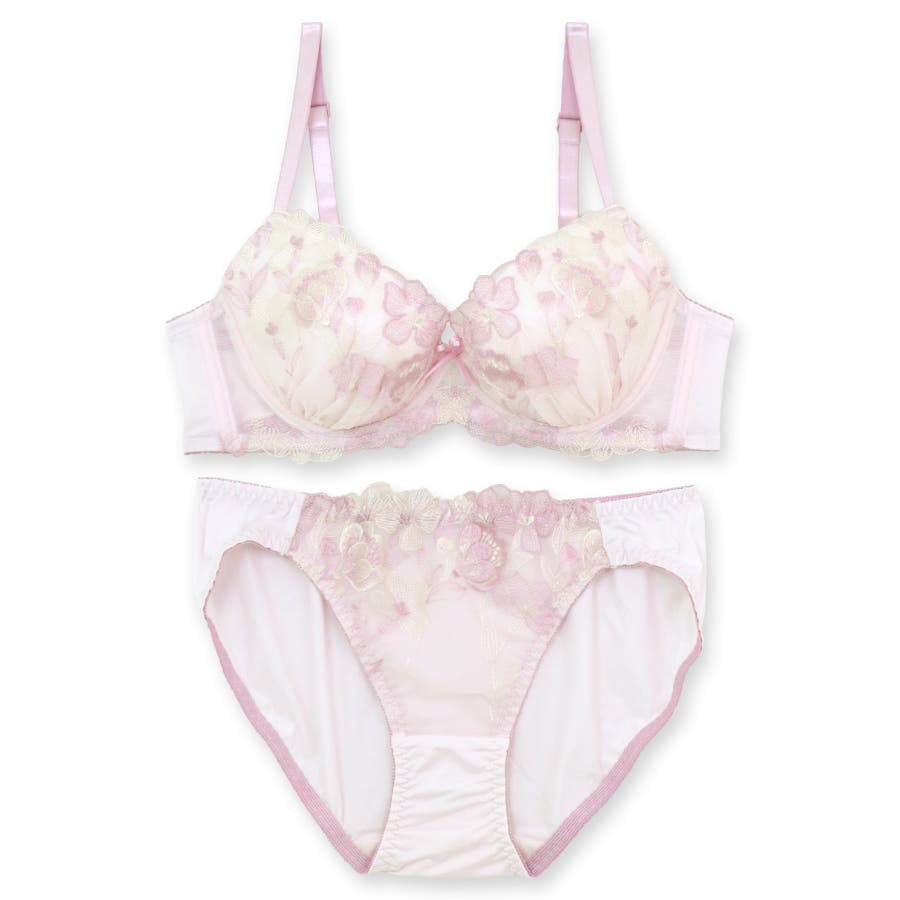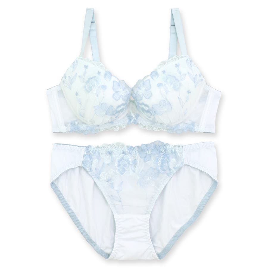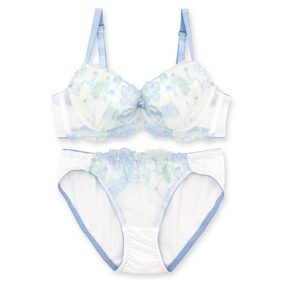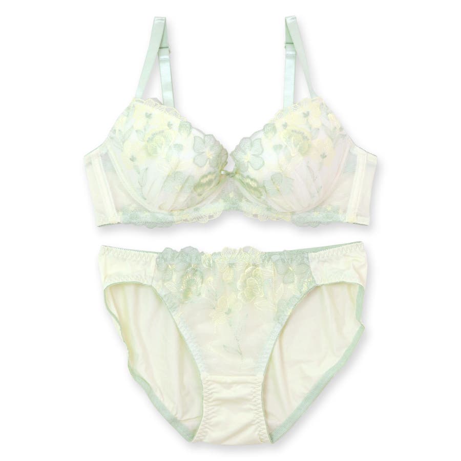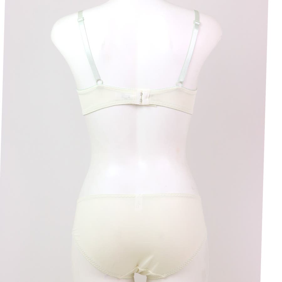 盛りすぎず、ナチュラルで自分らしいバストラインをメイクするブラは軽さも魅力。セットショーツは後ろ身頃の伸縮性が抜群でヒップにフィットするノーマルショーツタイプ。