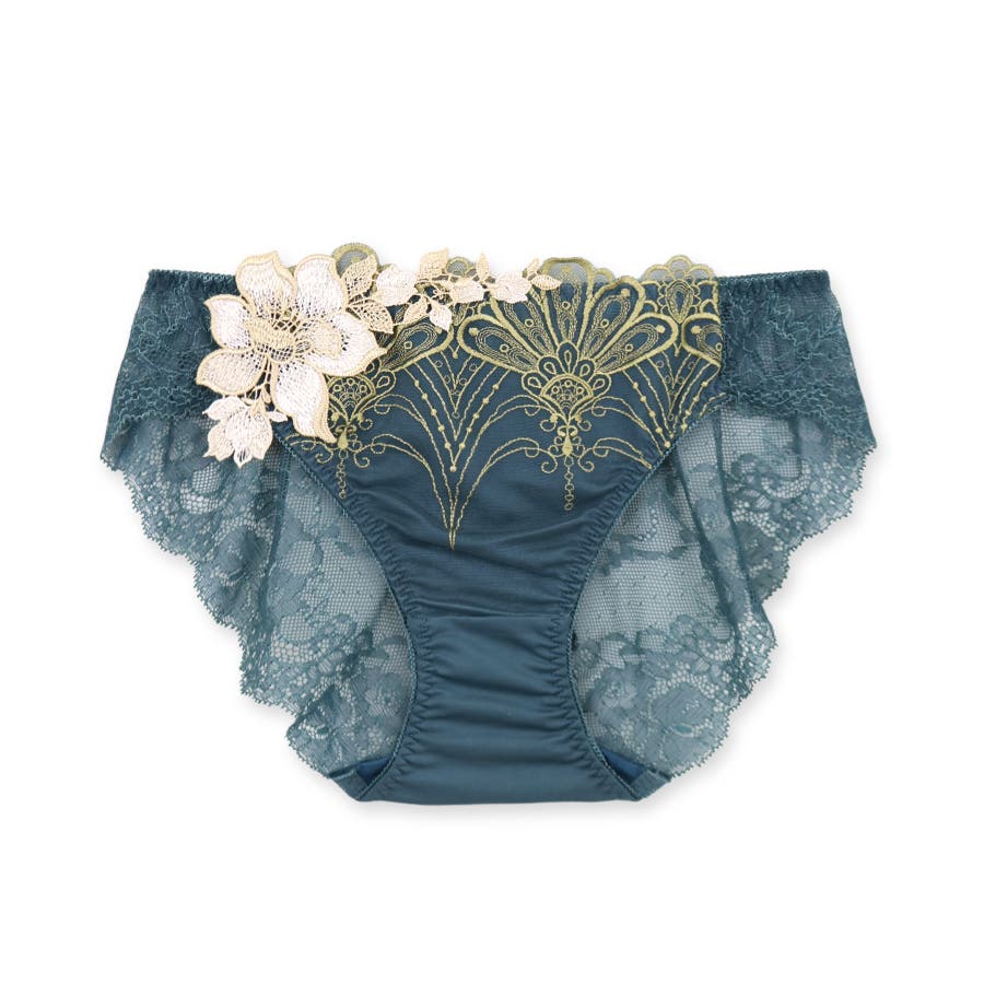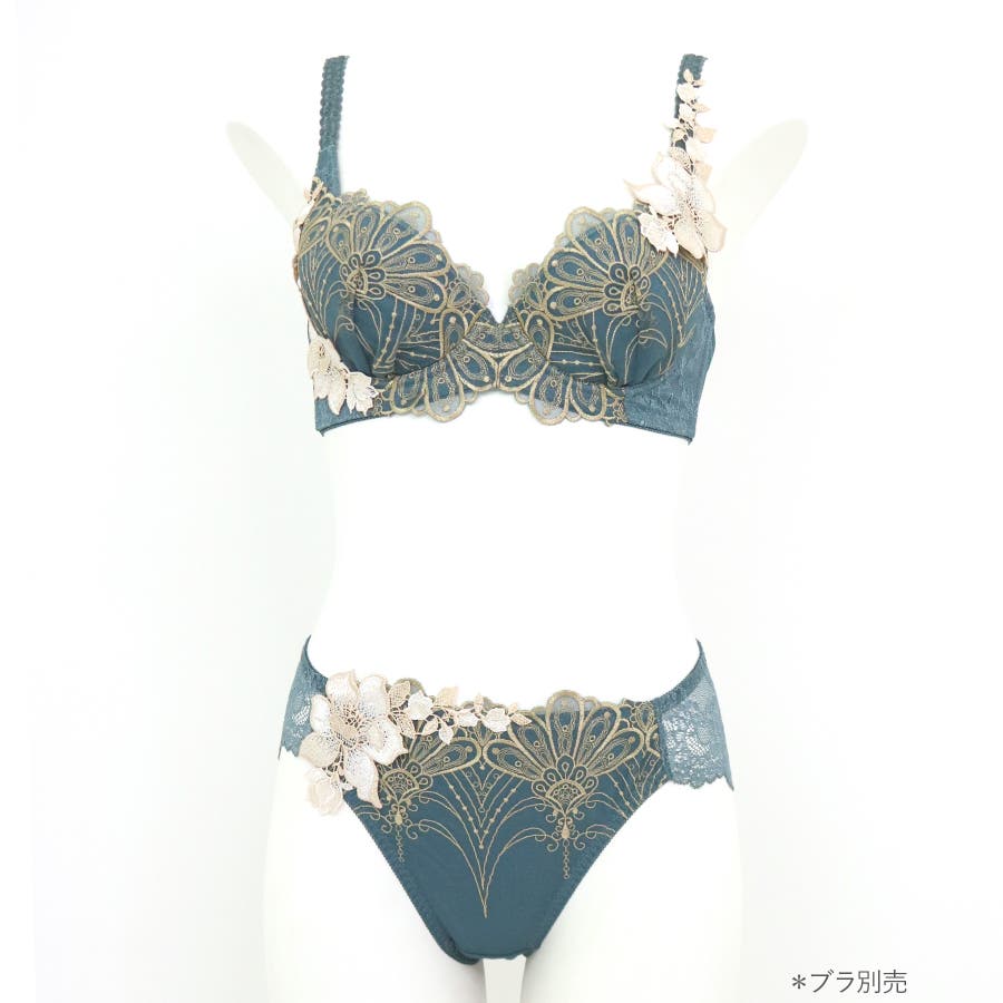 ピーコック柄のレースに存在感のあるフラワーモチーフを組み合わせたどこかエキゾチックな華やかなランジェリー。ブラジャー、スリップ、3種類のお揃いアイテムから好きなものを組み合わせて楽しめる別売りのシリーズ。