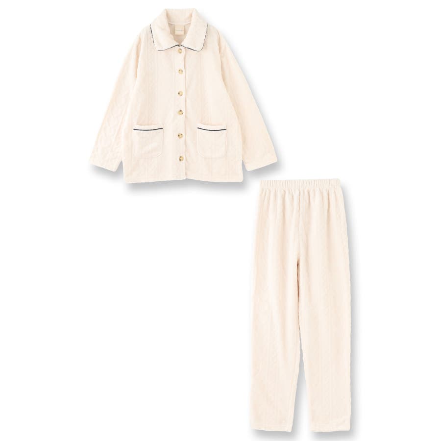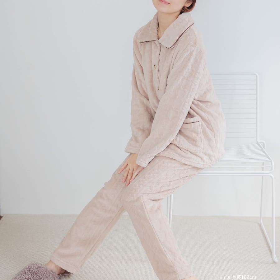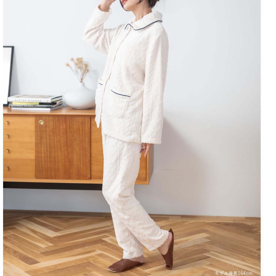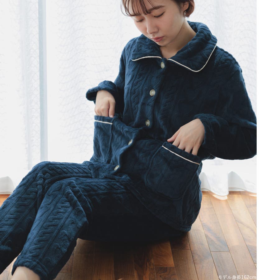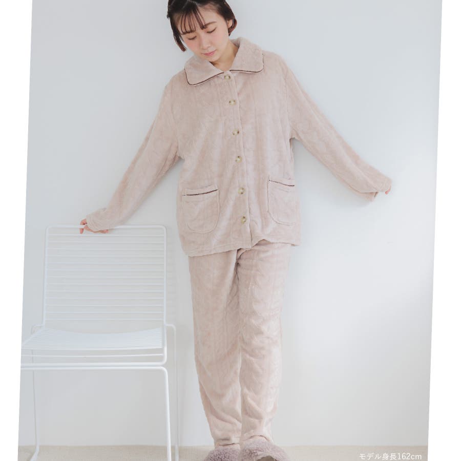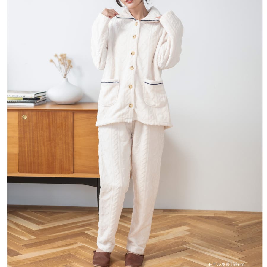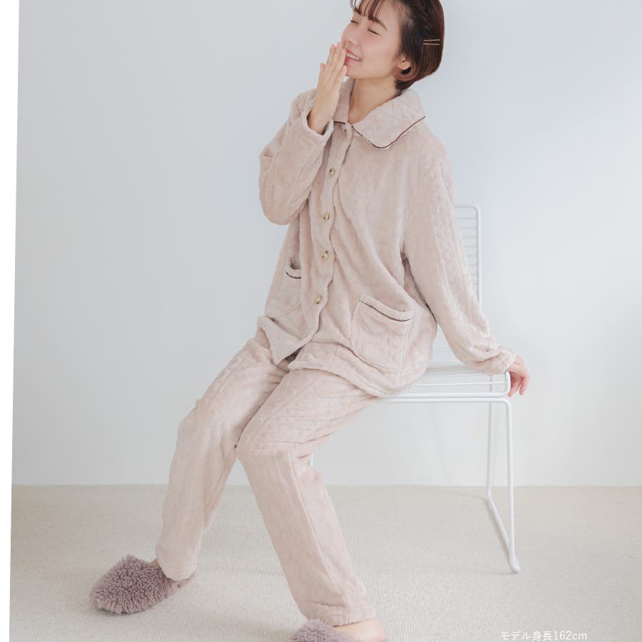 フロントがボタンで全開できるベーシックなパジャマタイプの上下セット。襟があるので冷えやすく首周りをしっかり温めたい方にもおすすめです。トップスにはスマホもすっぽり収まる便利なポケット付。