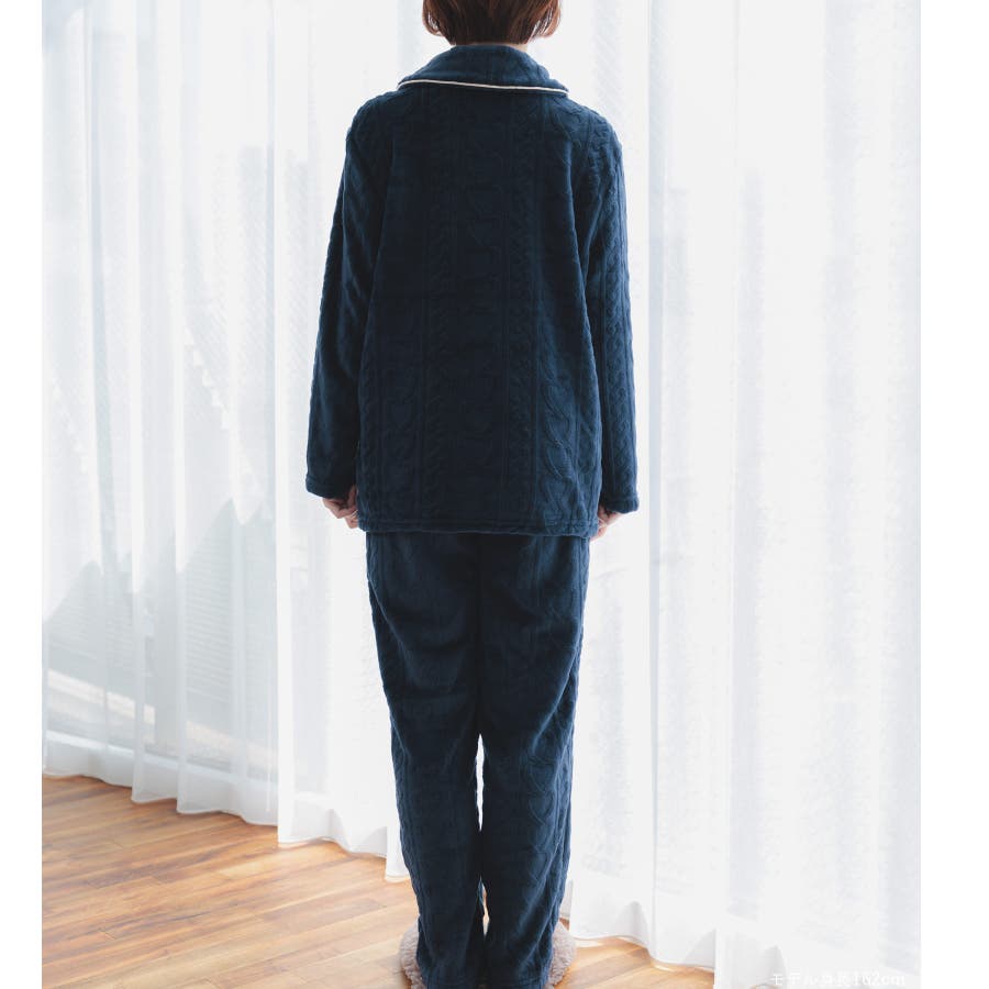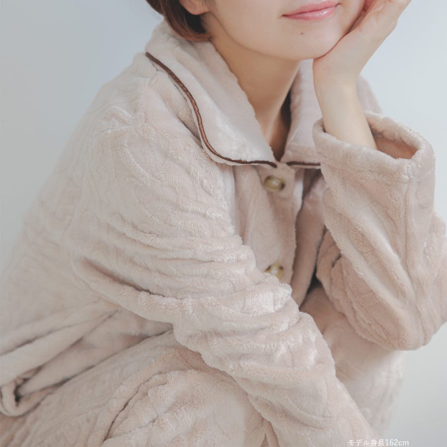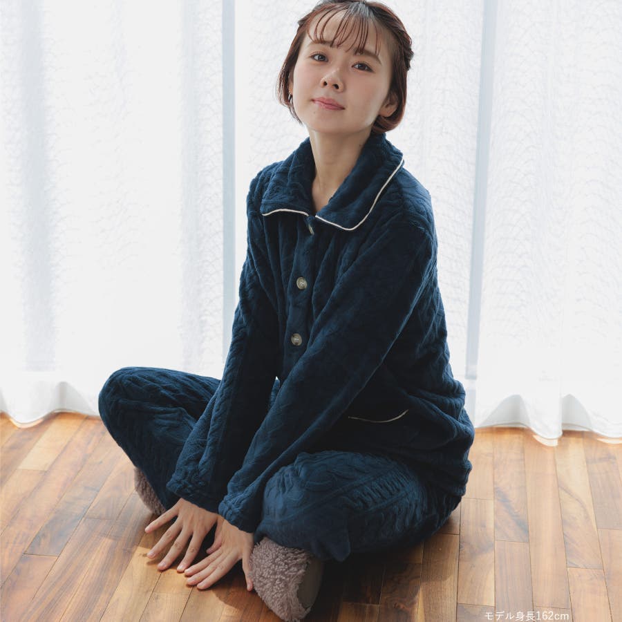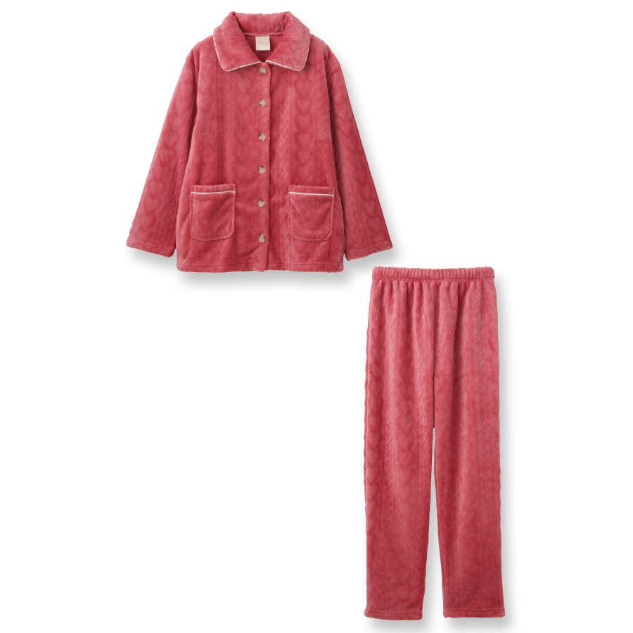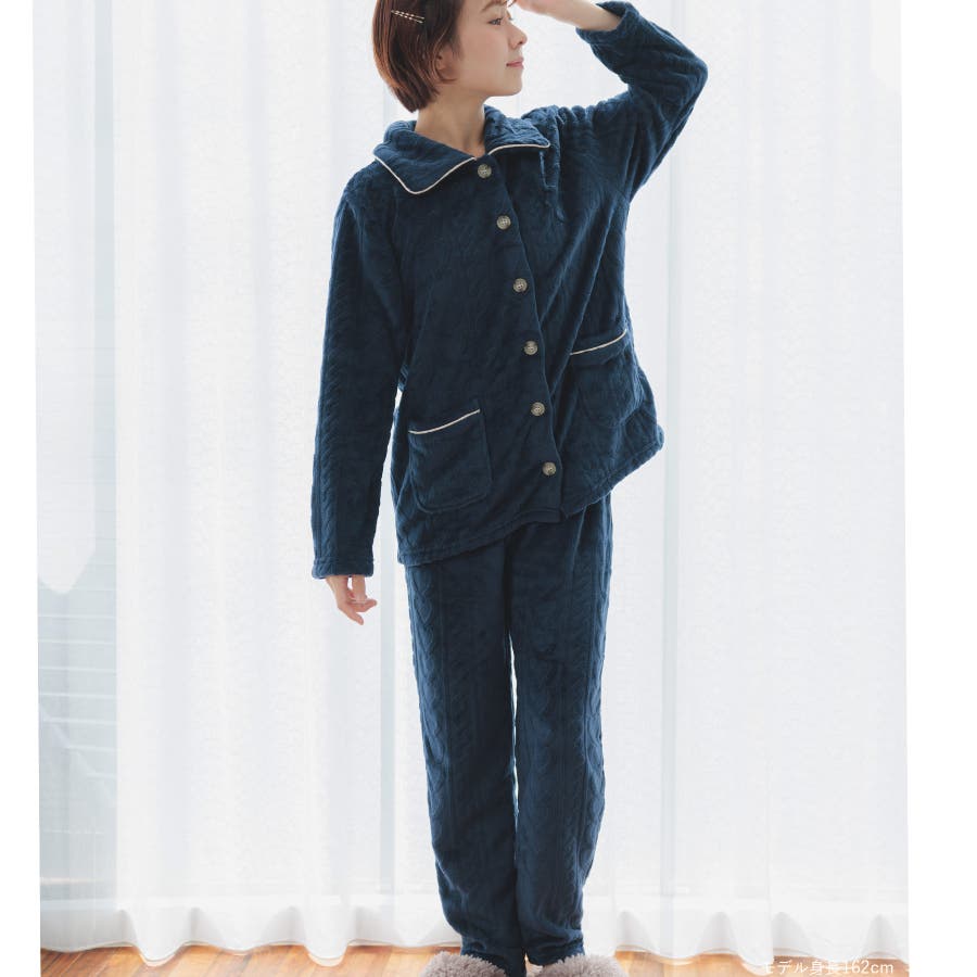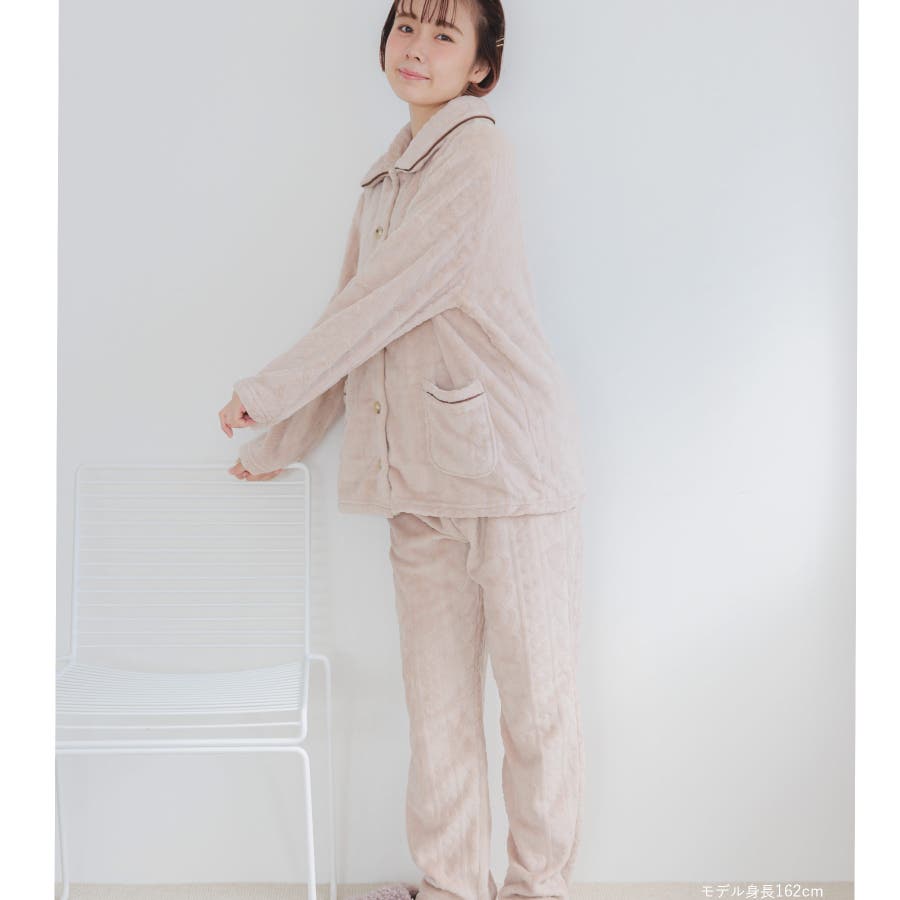 フロントがボタンで全開できるベーシックなパジャマタイプの上下セット。襟があるので冷えやすく首周りをしっかり温めたい方にもおすすめです。トップスにはスマホもすっぽり収まる便利なポケット付。