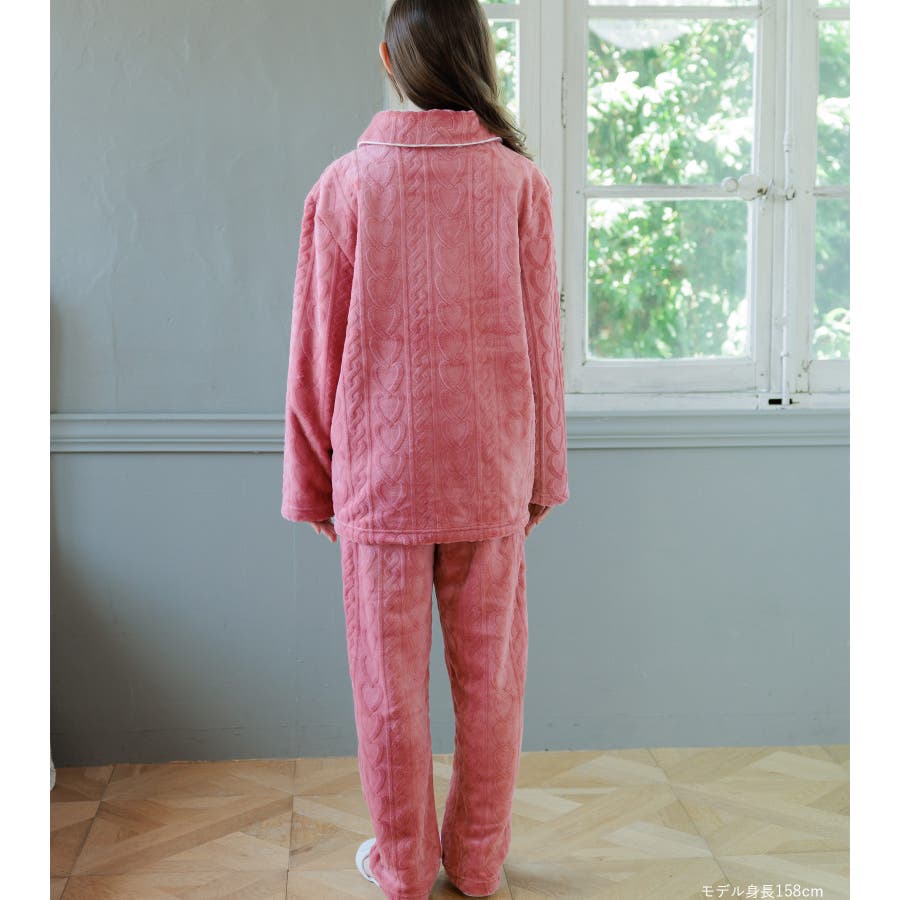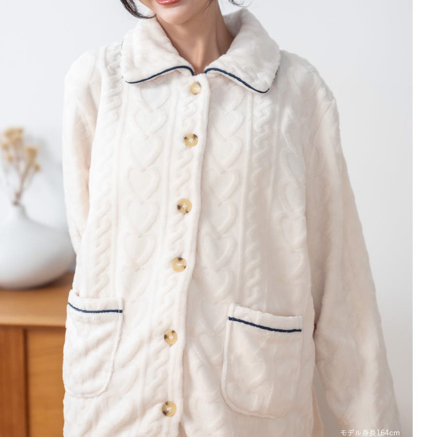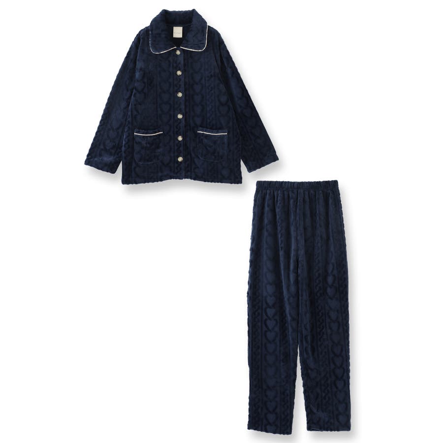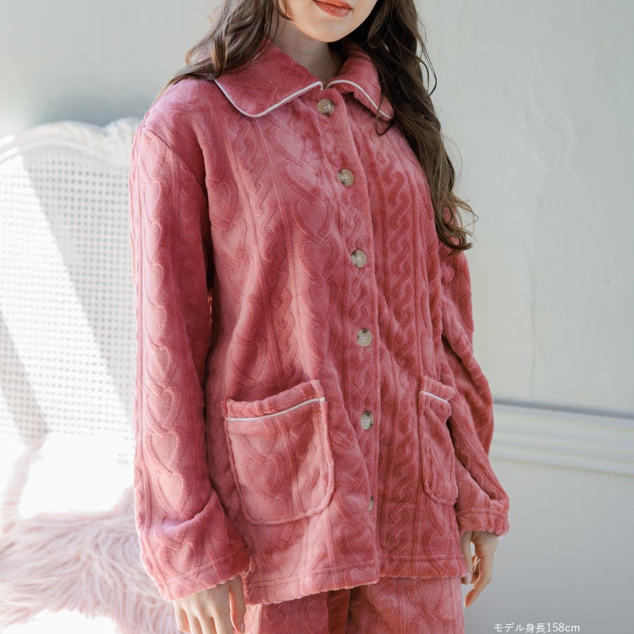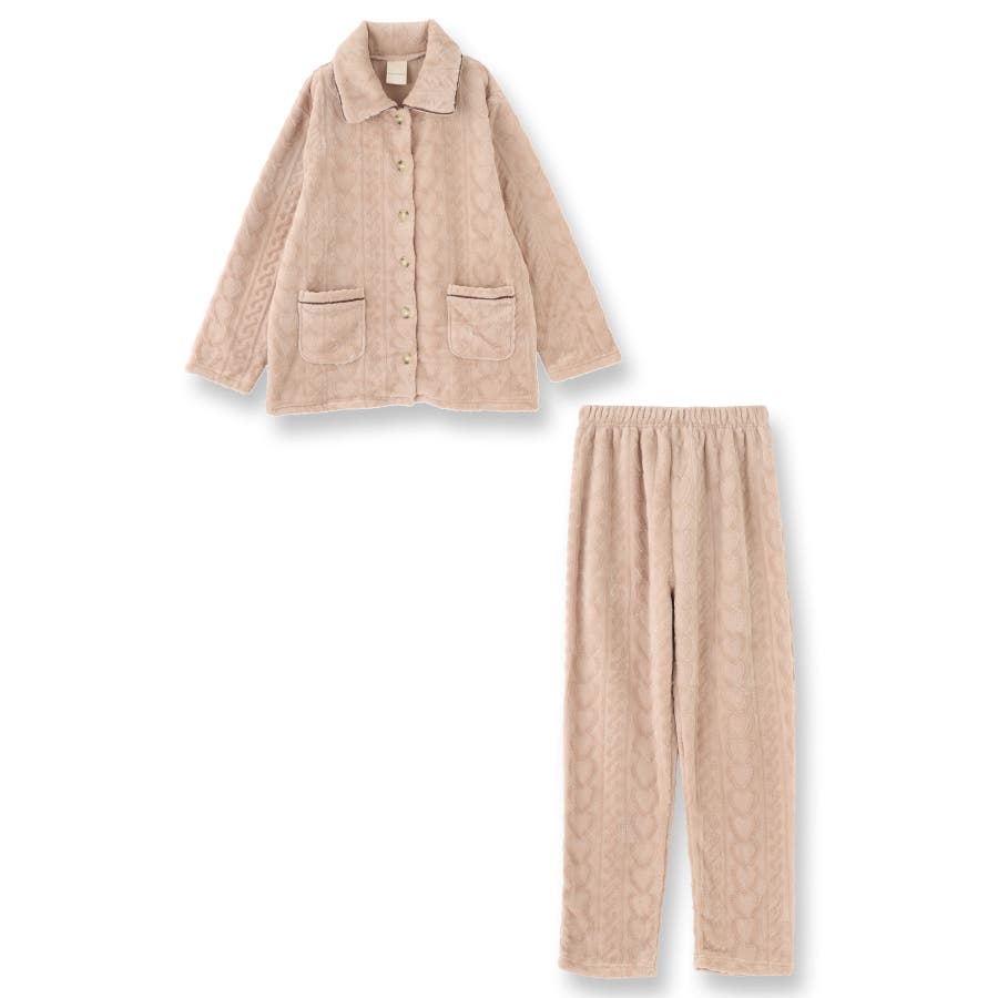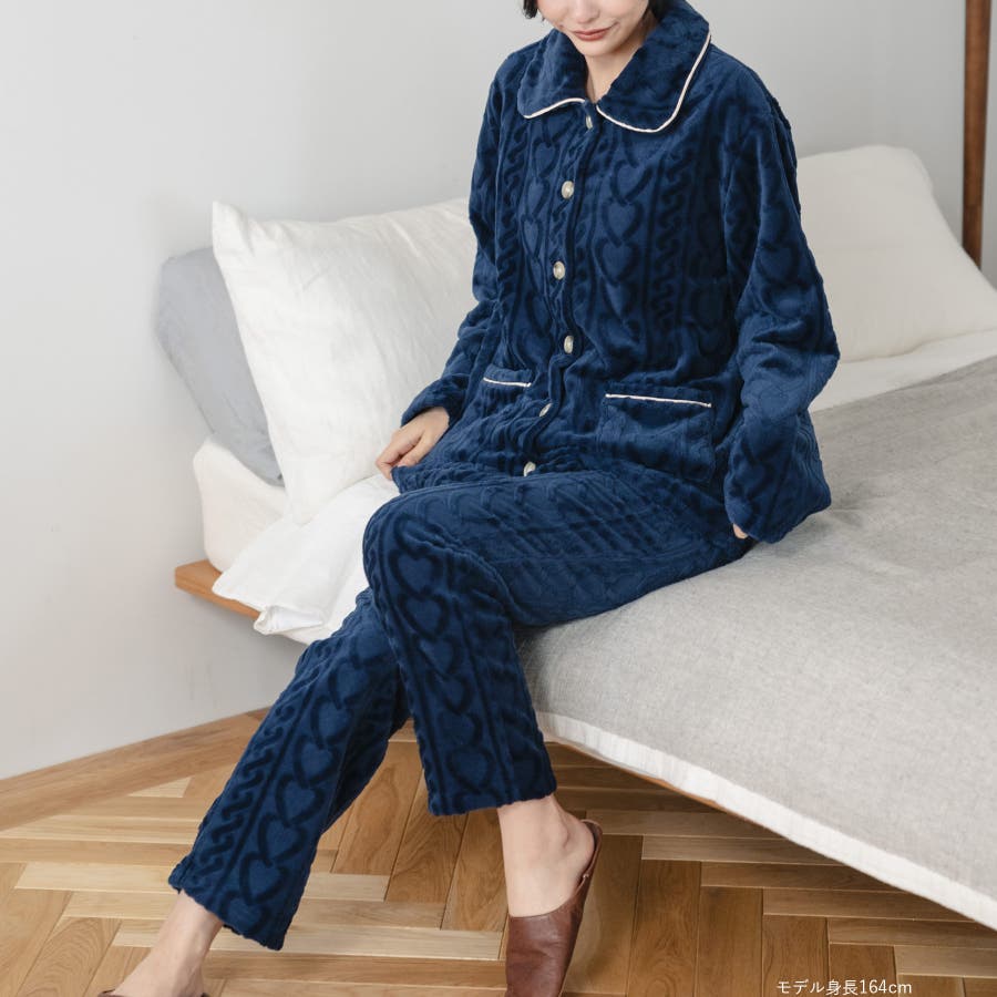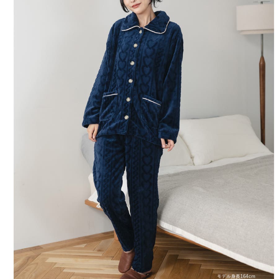 フロントがボタンで全開できるベーシックなパジャマタイプの上下セット。襟があるので冷えやすく首周りをしっかり温めたい方にもおすすめです。トップスにはスマホもすっぽり収まる便利なポケット付。
