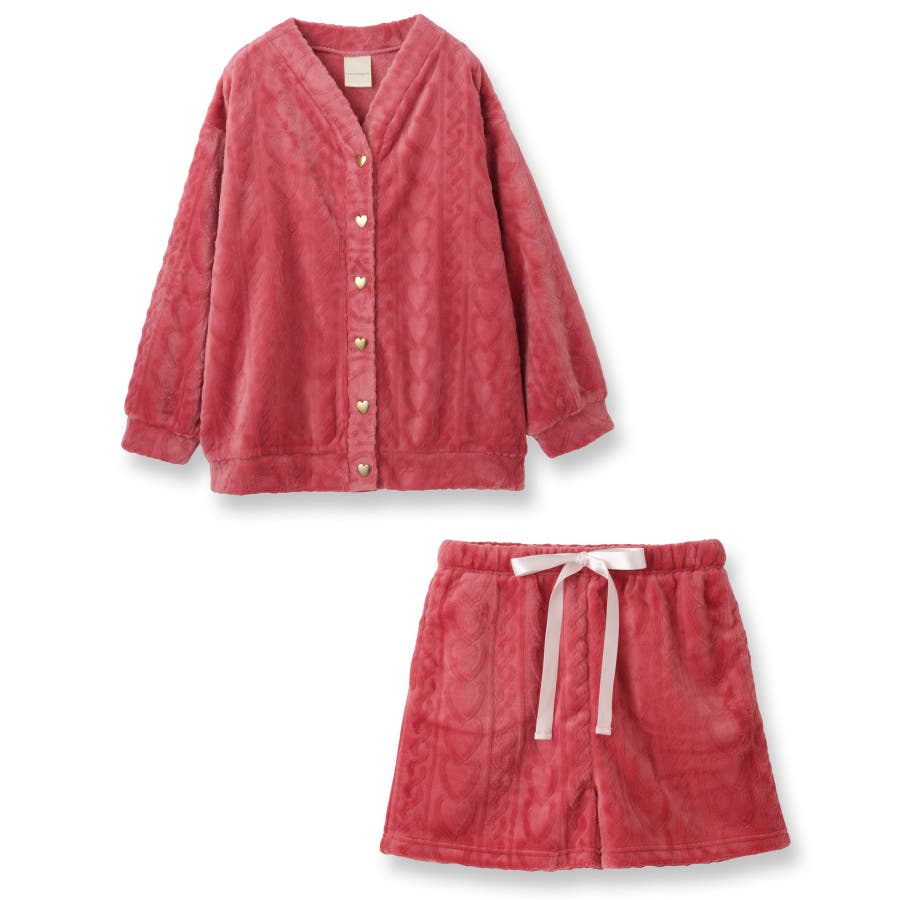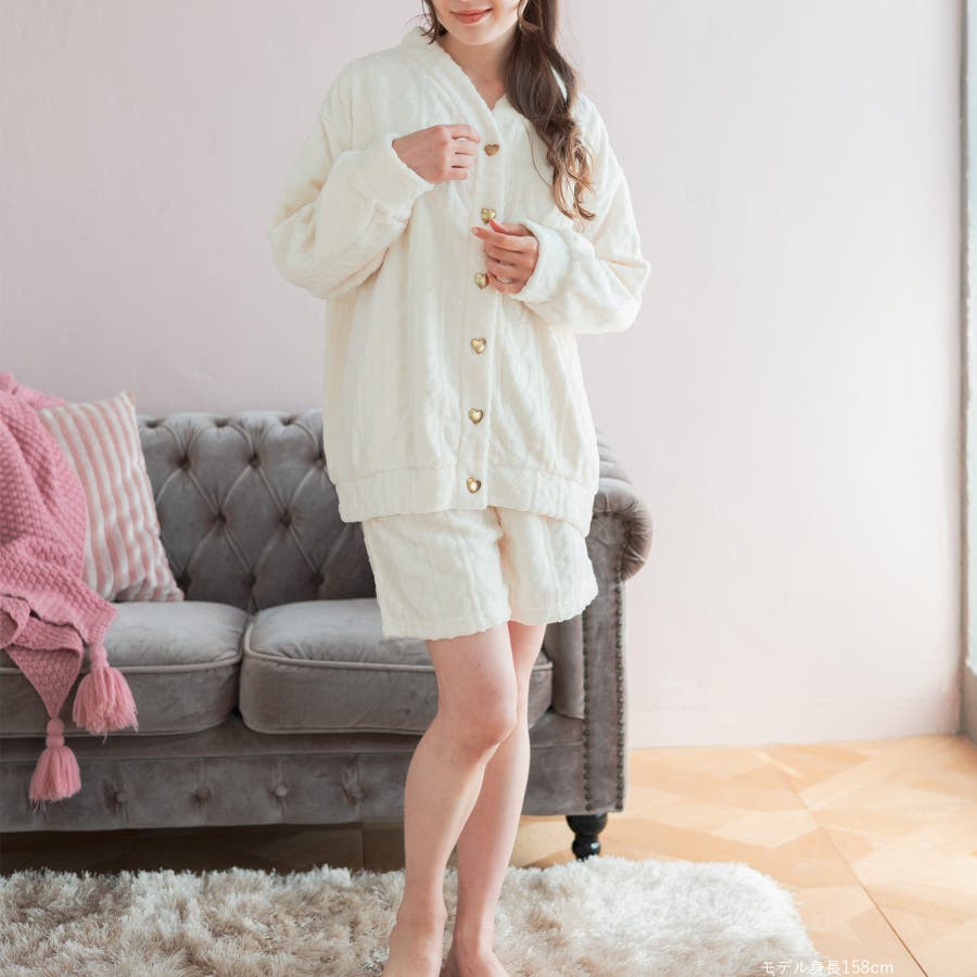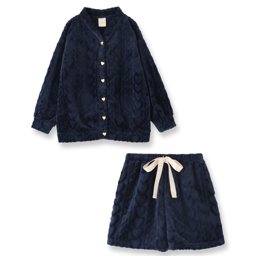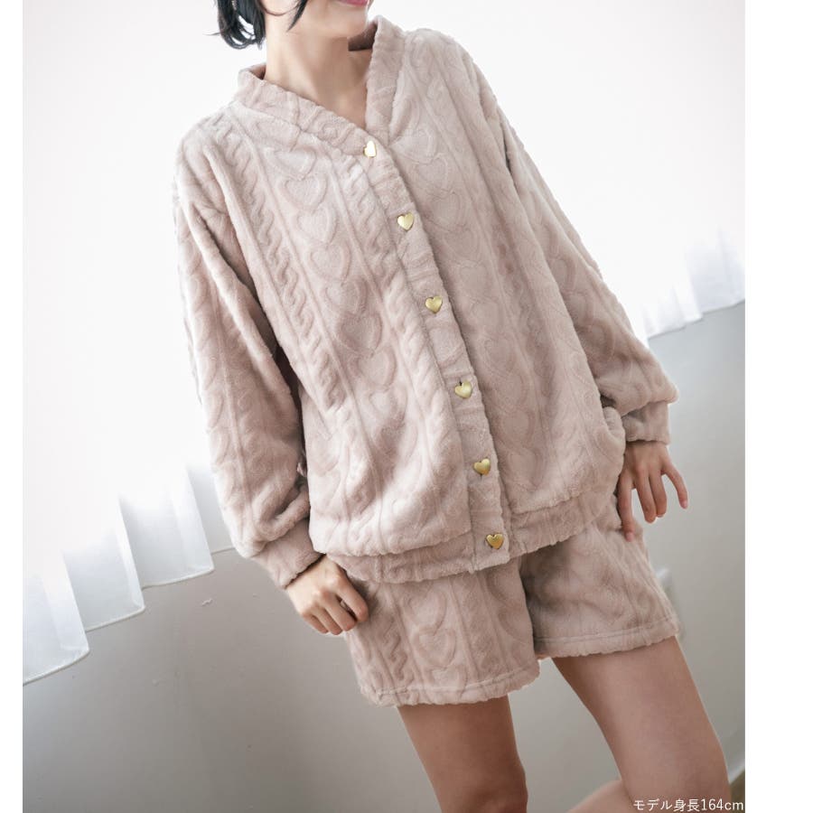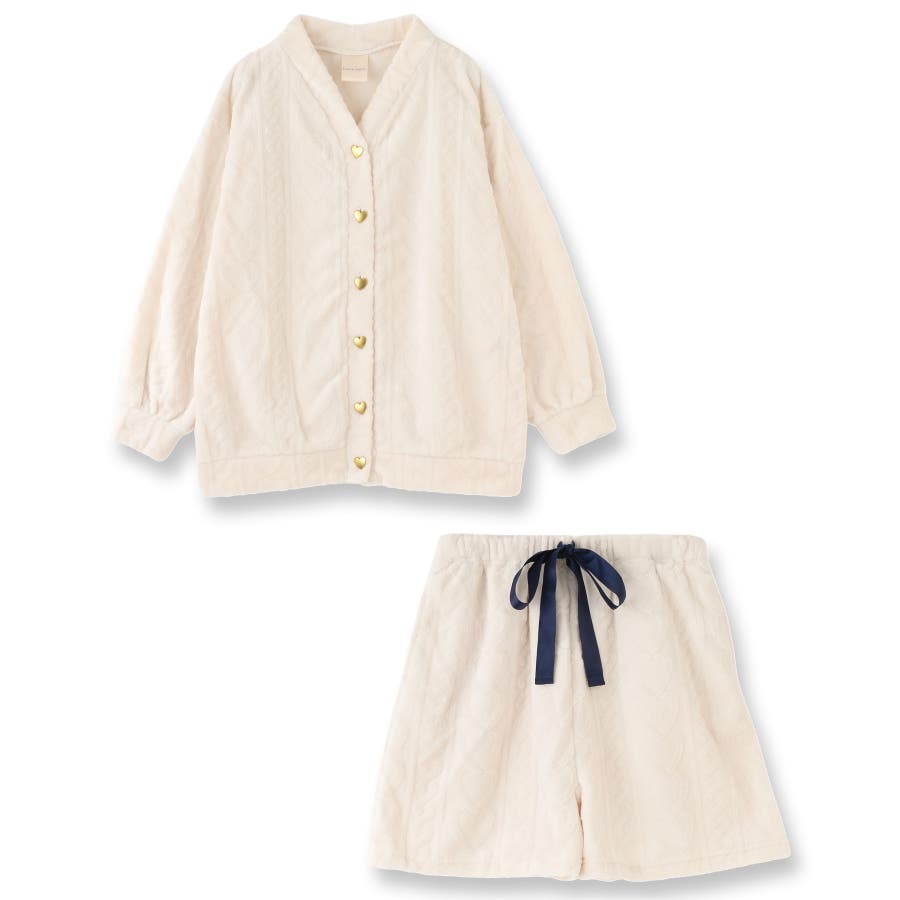 ハートのボタンやきゅっと絞られた袖口がキュートなカーディガンとショートパンツのセットアップ。もこもこのあったかソックスや、ロング丈の着圧タイプのソックスやレギンスなどとコーディネートが楽しめるデザイン。ボトムスは便利なポケットが付いています。