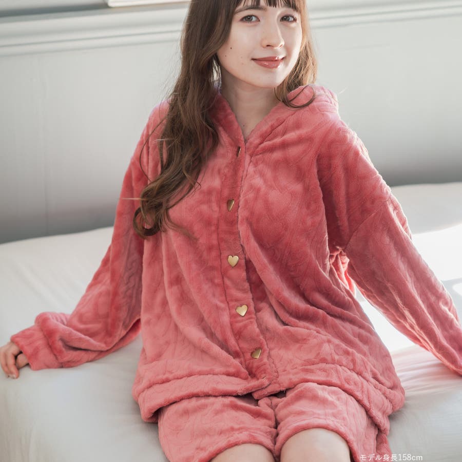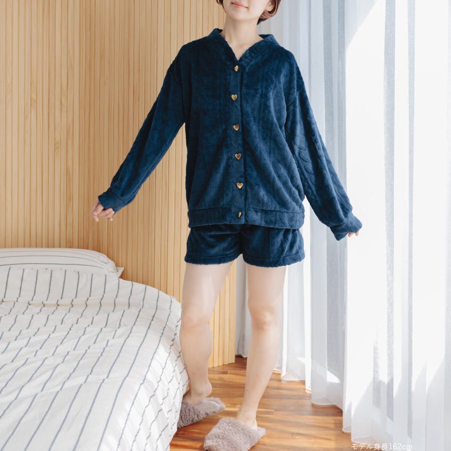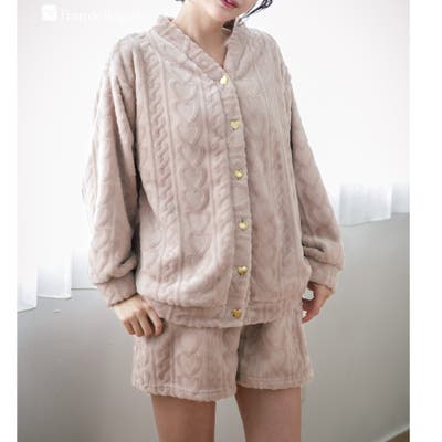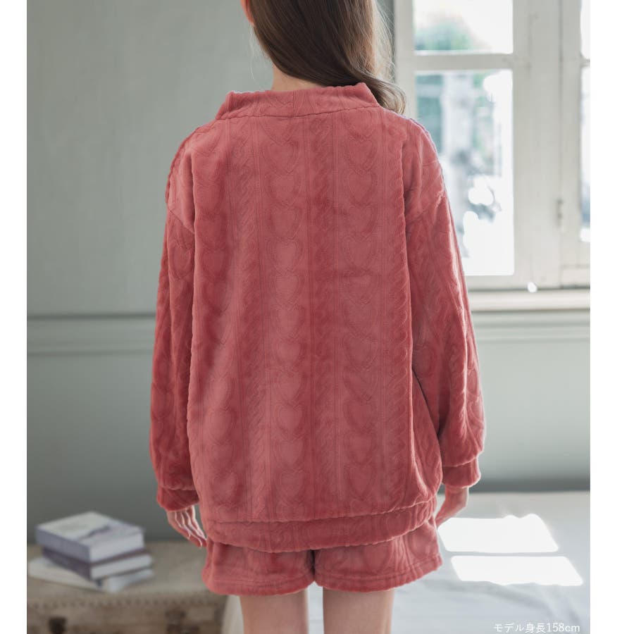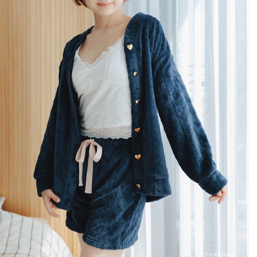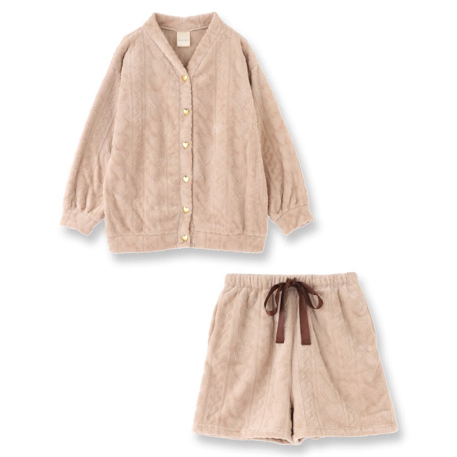 ハートのボタンやきゅっと絞られた袖口がキュートなカーディガンとショートパンツのセットアップ。もこもこのあったかソックスや、ロング丈の着圧タイプのソックスやレギンスなどとコーディネートが楽しめるデザイン。ボトムスは便利なポケットが付いています。