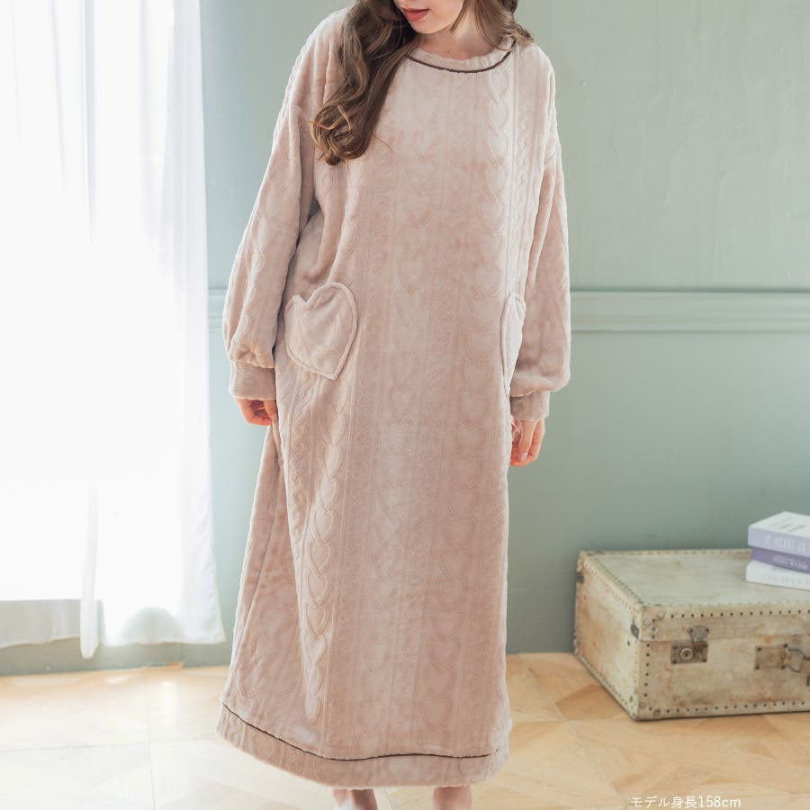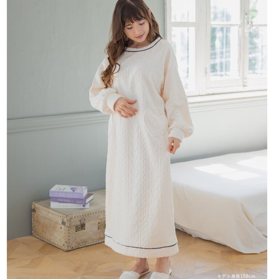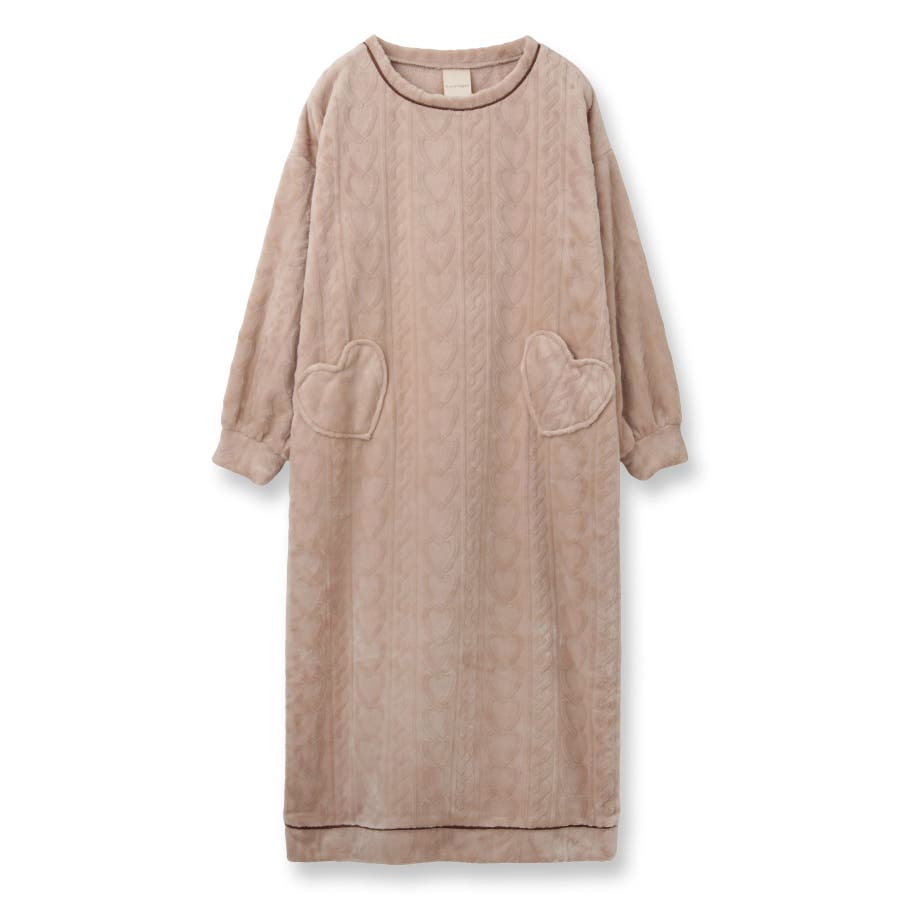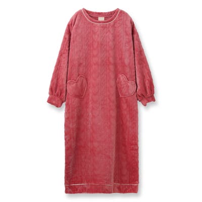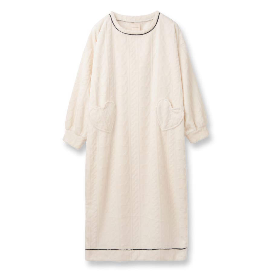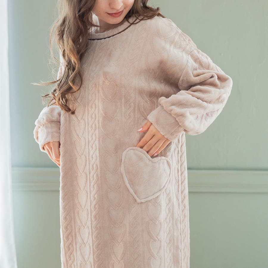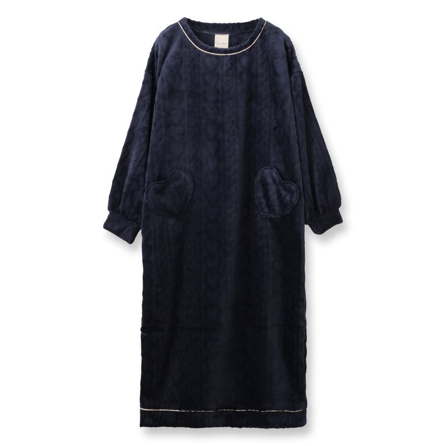 毛布を着るような、プルオーバータイプのロングワンピース。締め付け感がないからリラックスタイムにピッタリ。ハートのポケットはスマホが入るサイズ感です。