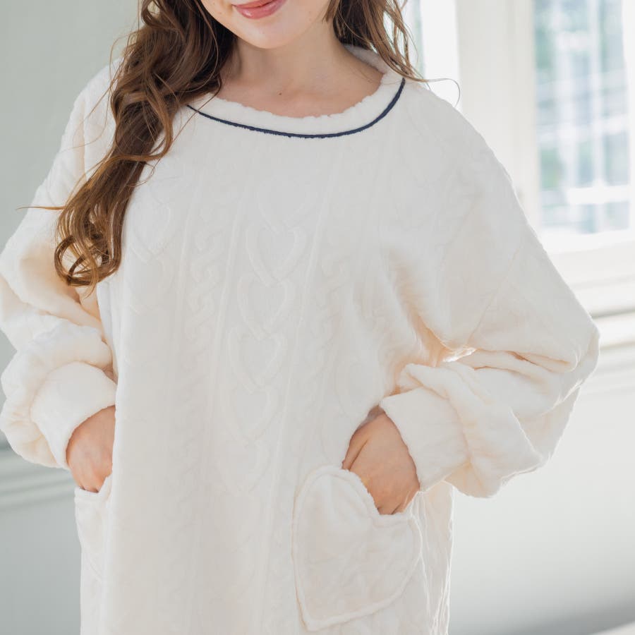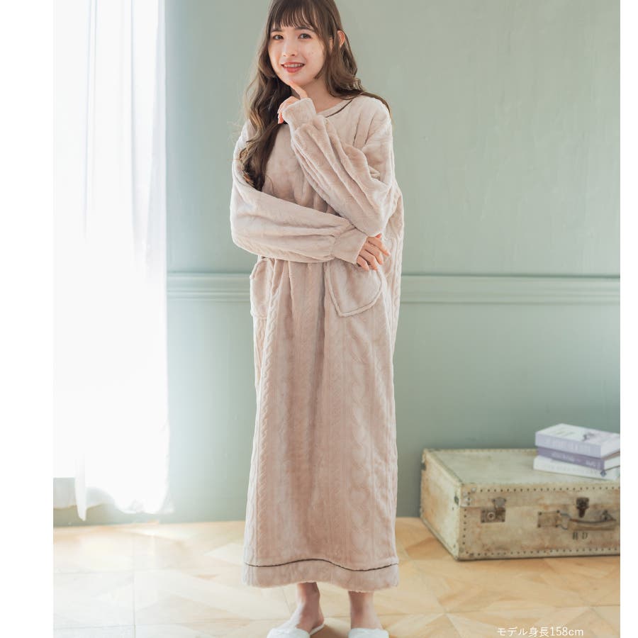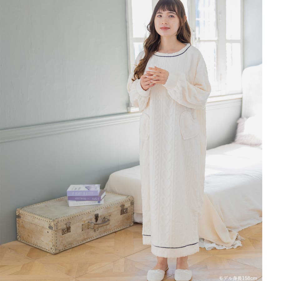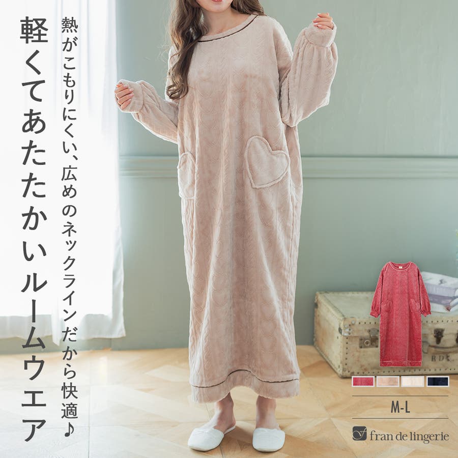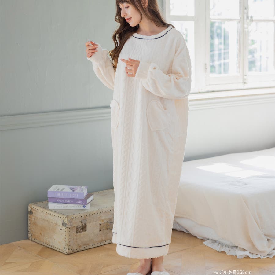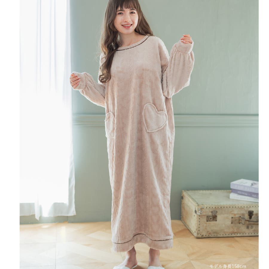 毛布を着るような、プルオーバータイプのロングワンピース。締め付け感がないからリラックスタイムにピッタリ。ハートのポケットはスマホが入るサイズ感です。