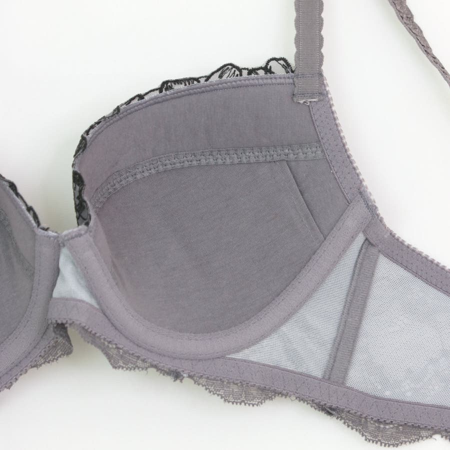 盛りすぎず、ナチュラルで自分らしいバストラインをメイクするブラは軽さも魅力。セットショーツは後ろ身頃の伸縮性が抜群でヒップにフィットするノーマルショーツタイプ。お肌のデリケートな部分が当たるカップ裏とショーツのマチ裏には綿100%の綿天竺を使用し、素肌に優しいこだわりも嬉しい。