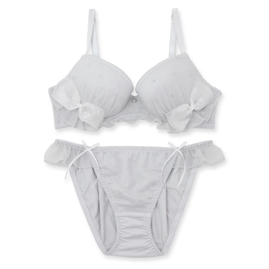 よく見るとハートの形になったドット柄がとびきりキュートな刺繍レースをフリルやリボンで囲んでさらに甘く。ニュアンスカラーで大人も楽しめるフェミニンランジェリー。