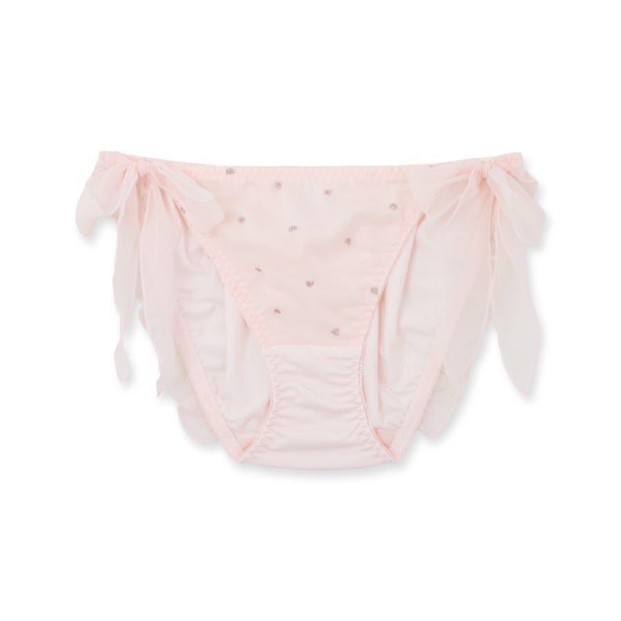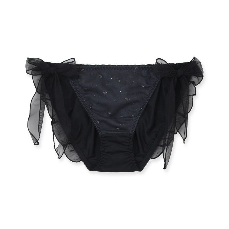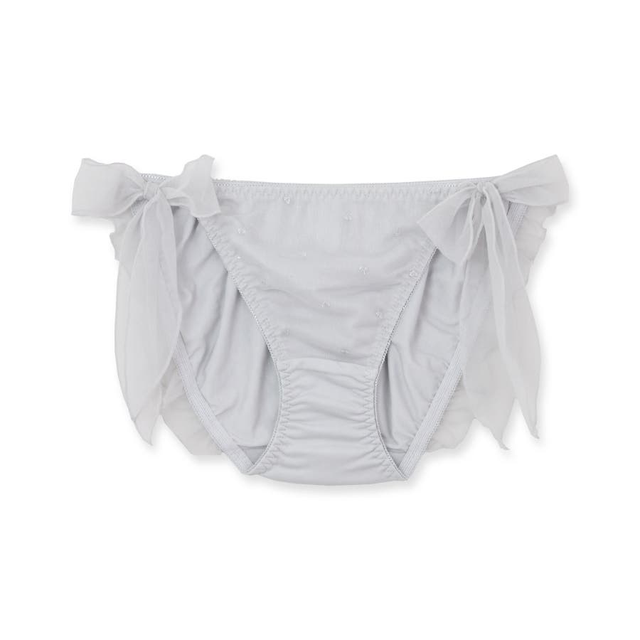 シフォンレースをリボンに結ぶ紐ショーツ。サイドはゴムが入っているので解けてしまっても脱げません。お肌のデリケートな部分に触れるマチ裏は綿100%の綿天竺を使用しています。