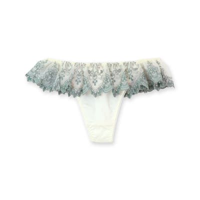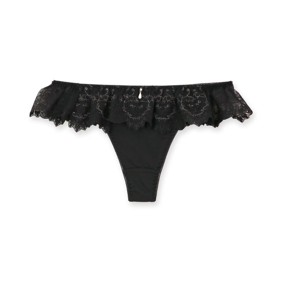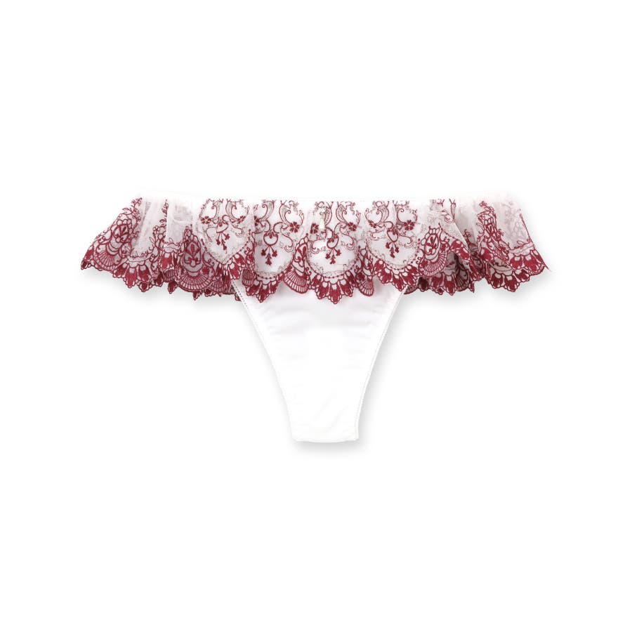 刺繍レースをたっぷり使ったフリルがウェストを一周するリュクスなデザインのTバックショーツ。ヒップラインを綺麗に見せるおしゃれアイテムの必需品。