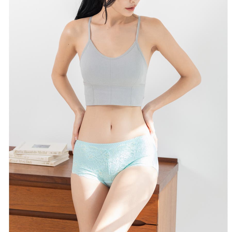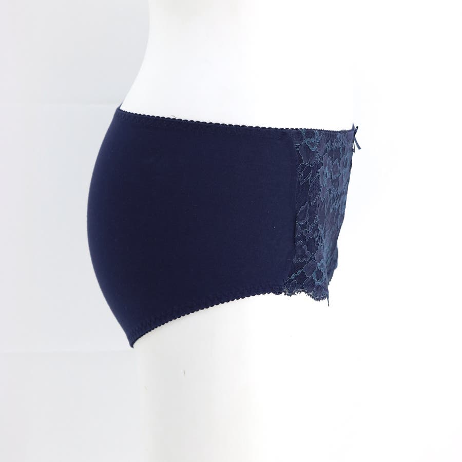 2回染めで綺麗な色を出す二浴レースを使用してシンプルながら上品なデザインに。綿の混率が高いので、お肌が敏感になる時期に嬉しい♪足周りにゴムがないので圧迫感や締め付けが少ないのがポイント◎ありそうで見つからないヒップハンガータイプ。