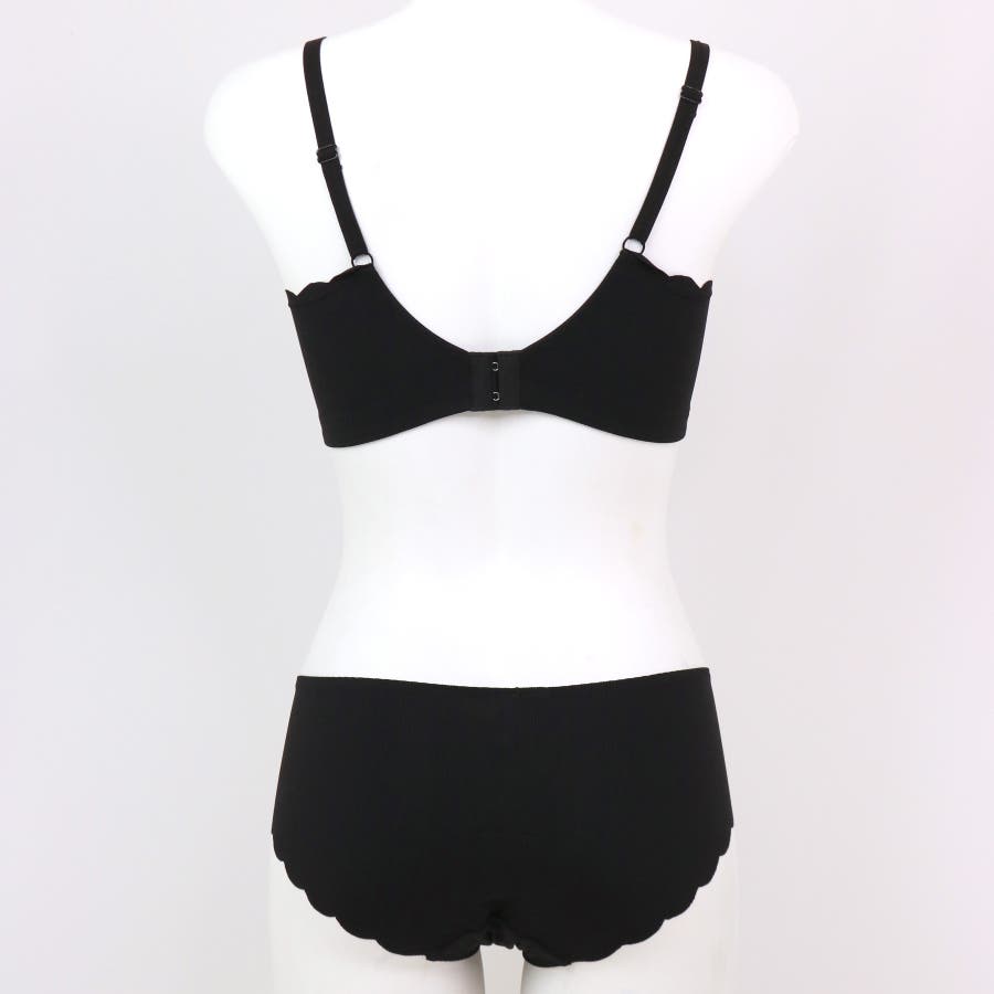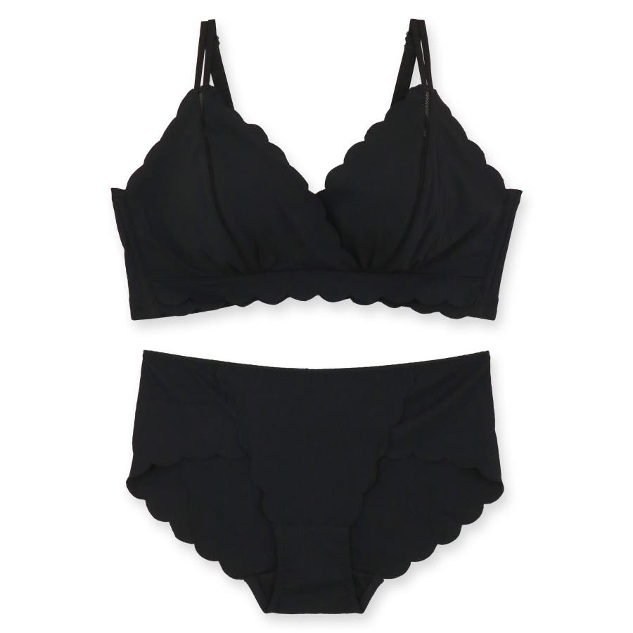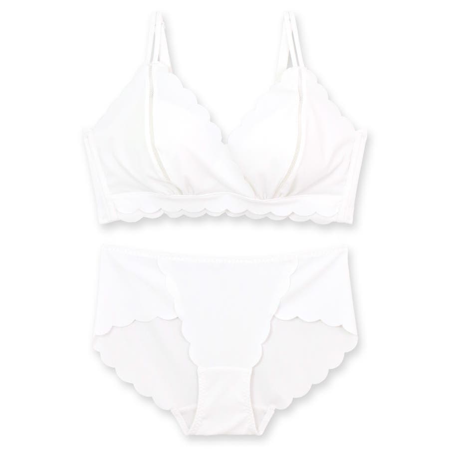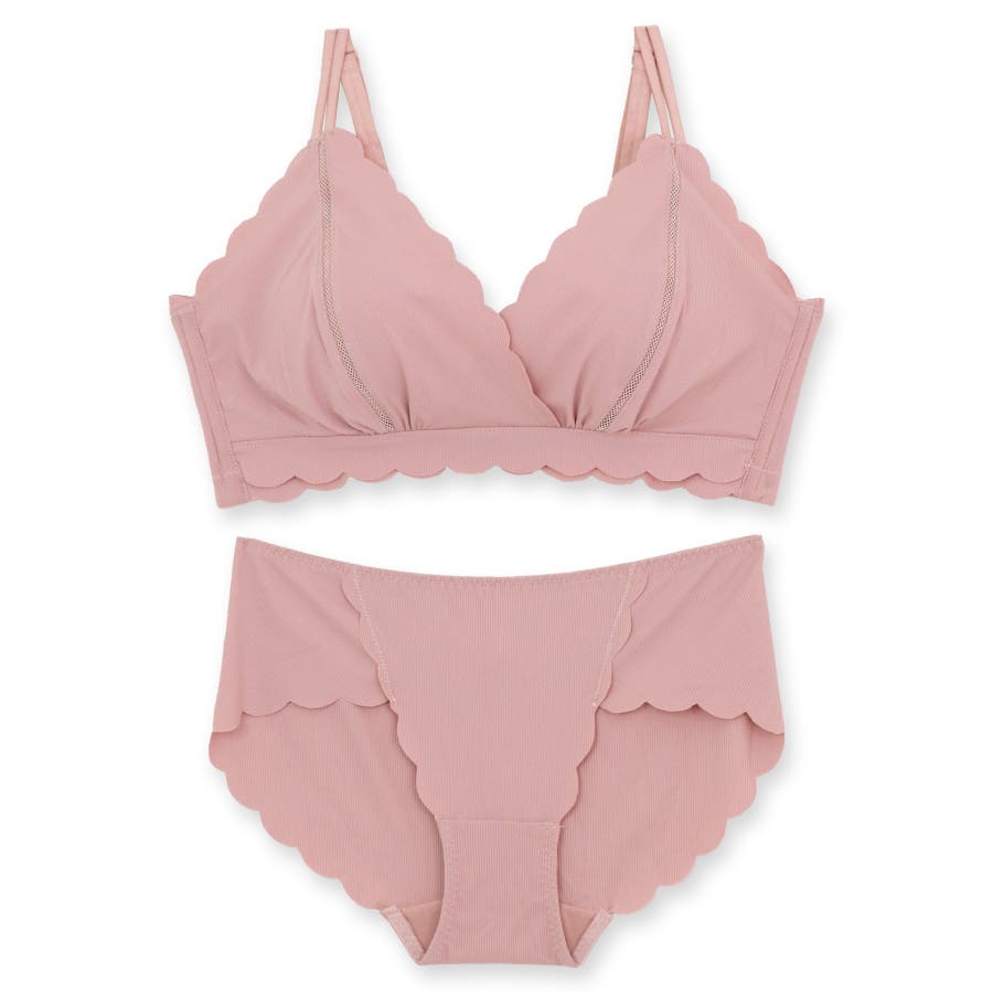 ブラとしての機能を保ちつつ、ブラレットのような軽さを楽しめるノンワイヤーブラとショーツのセット。シンプルリブ生地は伸縮性があり、肌なじみが良いので着心地も◎。スカラップのカット処理でファッションにも響きにくいのも魅力。セットショーツは使い勝手のいいノーマルショーツ。カップ裏&ショーツマチ裏は綿100%でお肌に優しいのも嬉しいポイント。