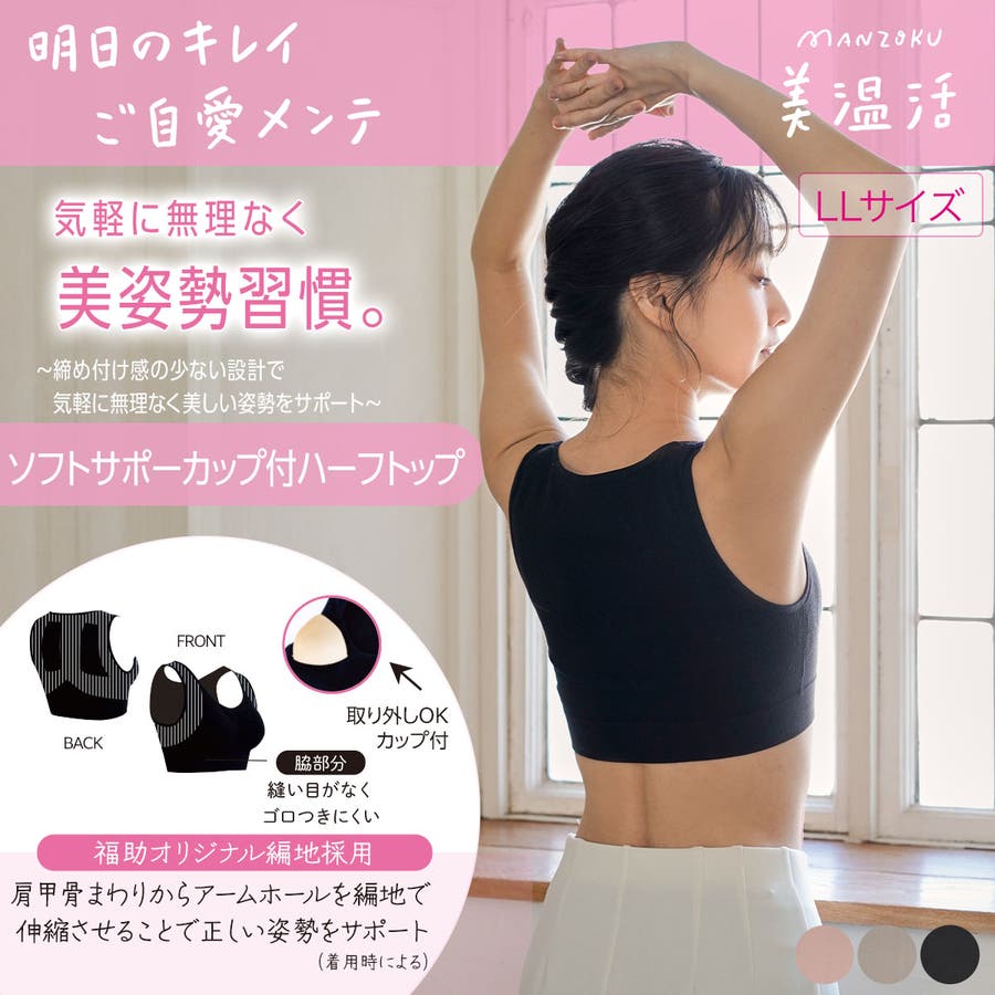 美温活の美姿勢サポートインナー「ご自愛メンテ」シリーズのハーフトップです。肩甲骨まわりは福助オリジナルの編地で伸縮させることで、気軽に無理なく美しい姿勢をサポートします。取り外せる通気性の良いメッシュタイプのカップ、ケアネームは転写プリントでゴロつきにくいのもおすすめです。締め付けにくい設計で、毎日着用いただけます。。
