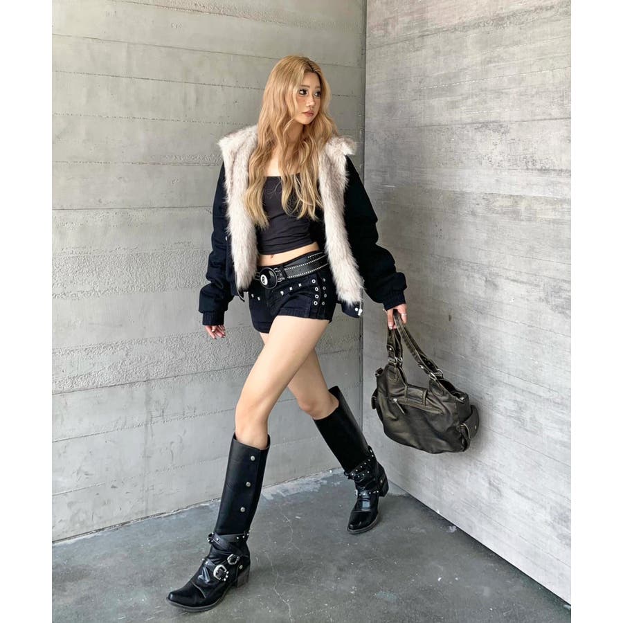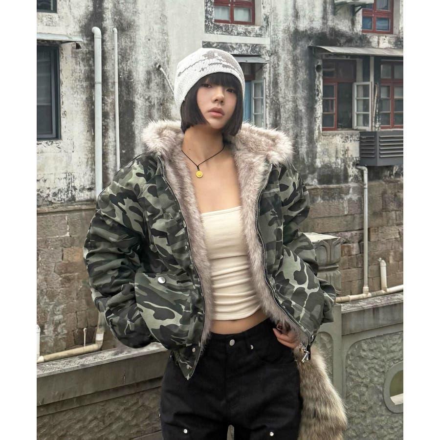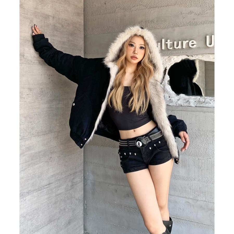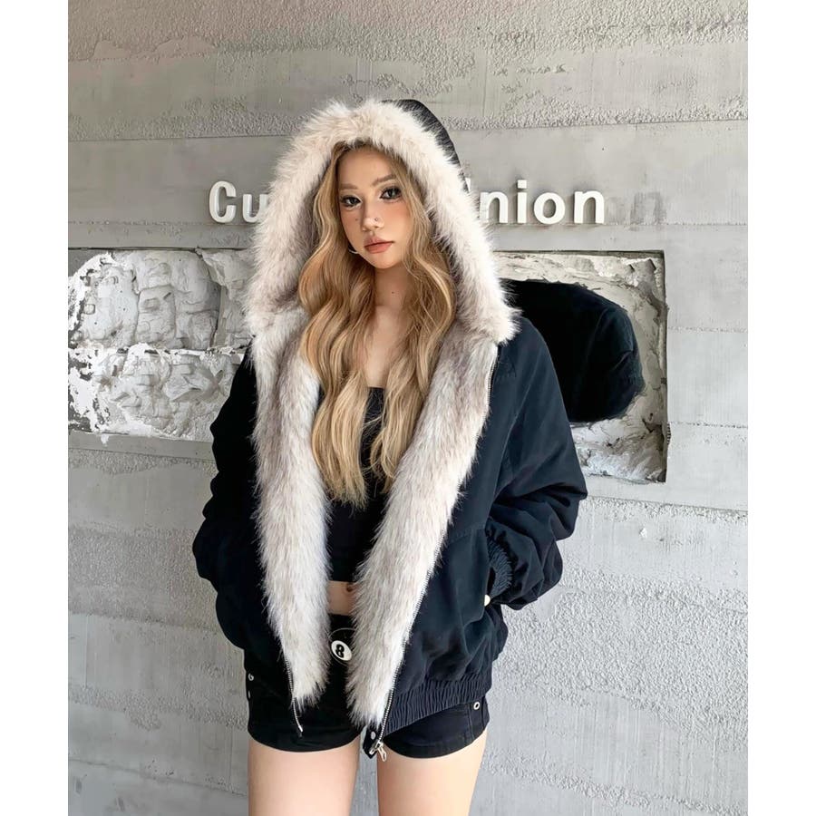 フードと前立てのボリュームファーで顔周りを華やかに見せ、小顔効果が期待できる一着。