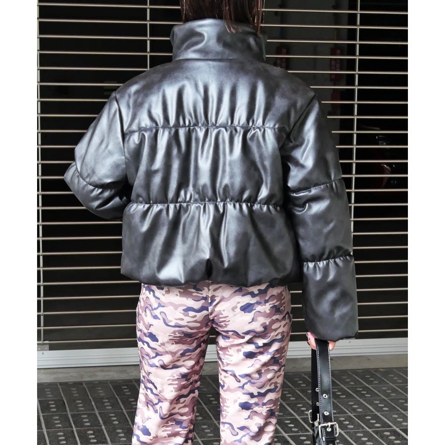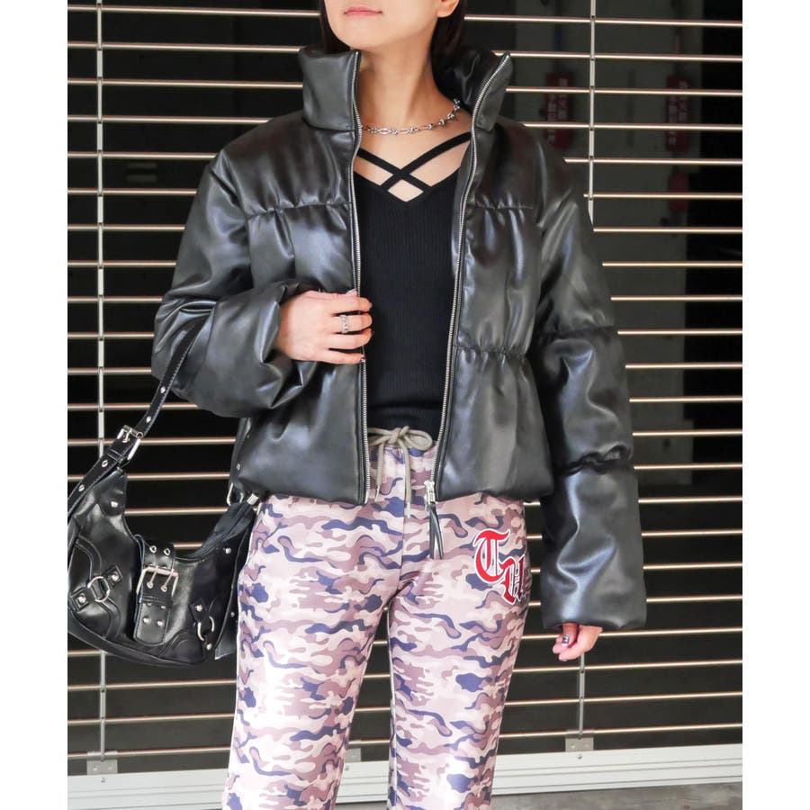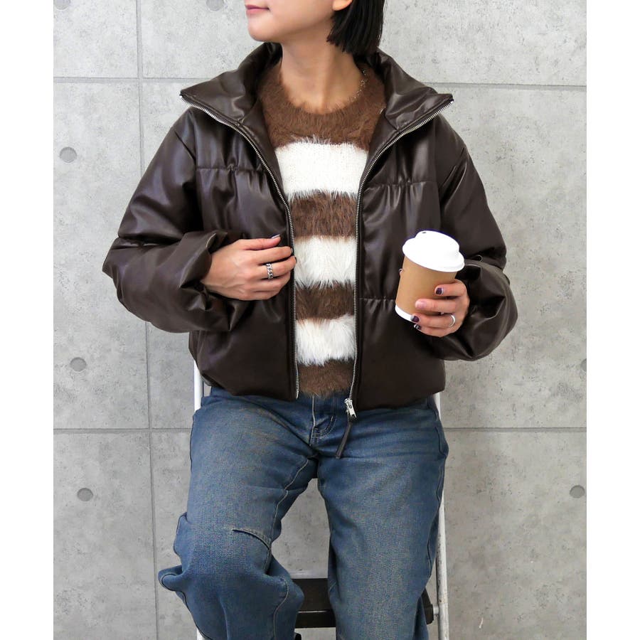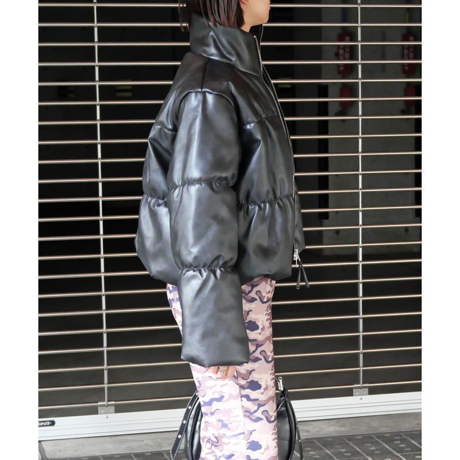 トレンドのフェイクレザーのモード感で、カジュアルな中綿ジャケットをスタイリッシュに格上げ。