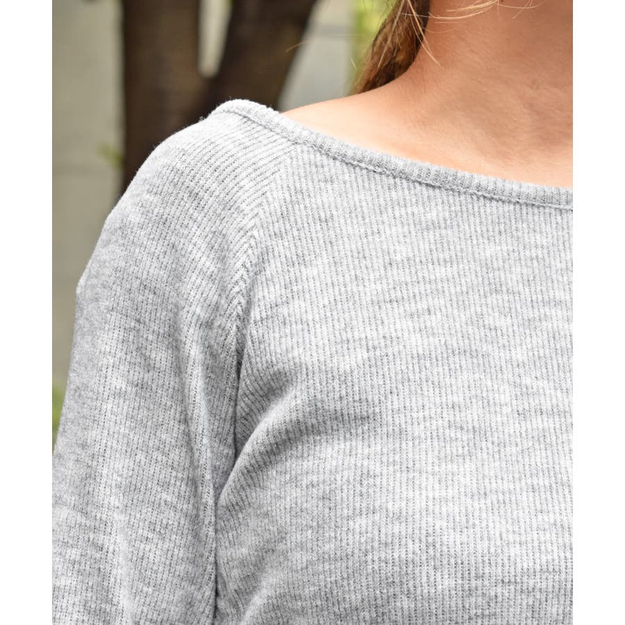 デコルテをきれいに見せるネックラインですっきりと見せ、カジュアルながらも女性らしい抜け感を演出します。