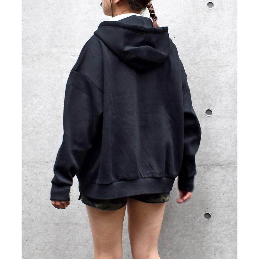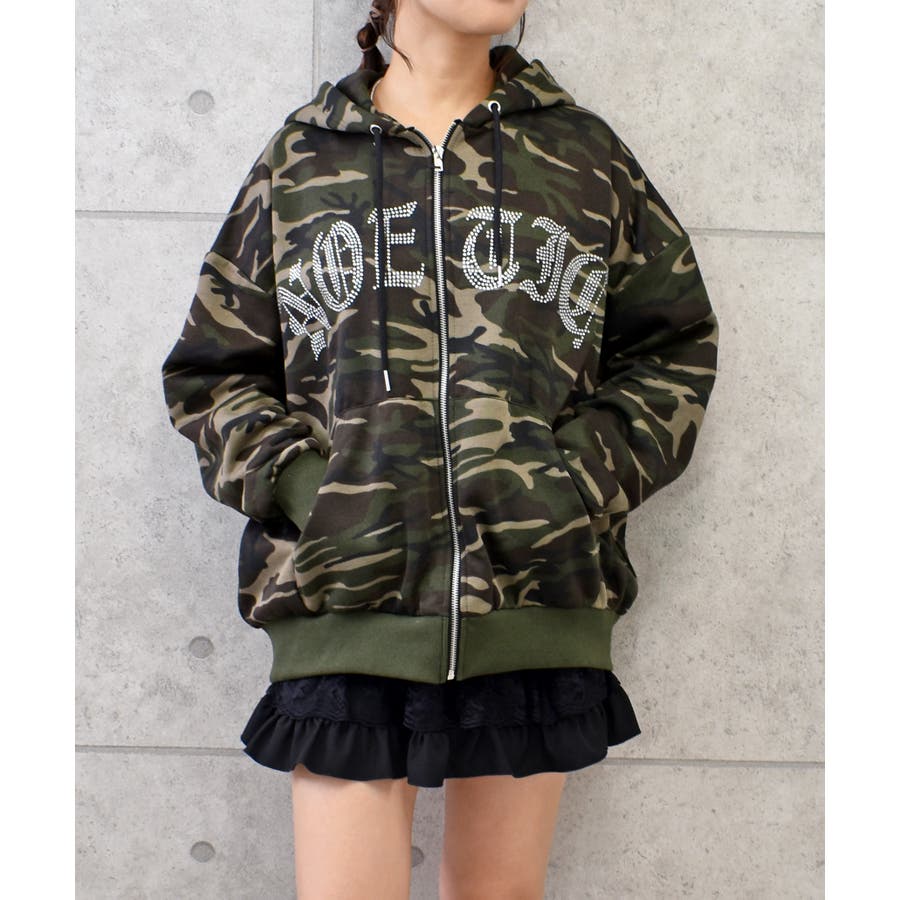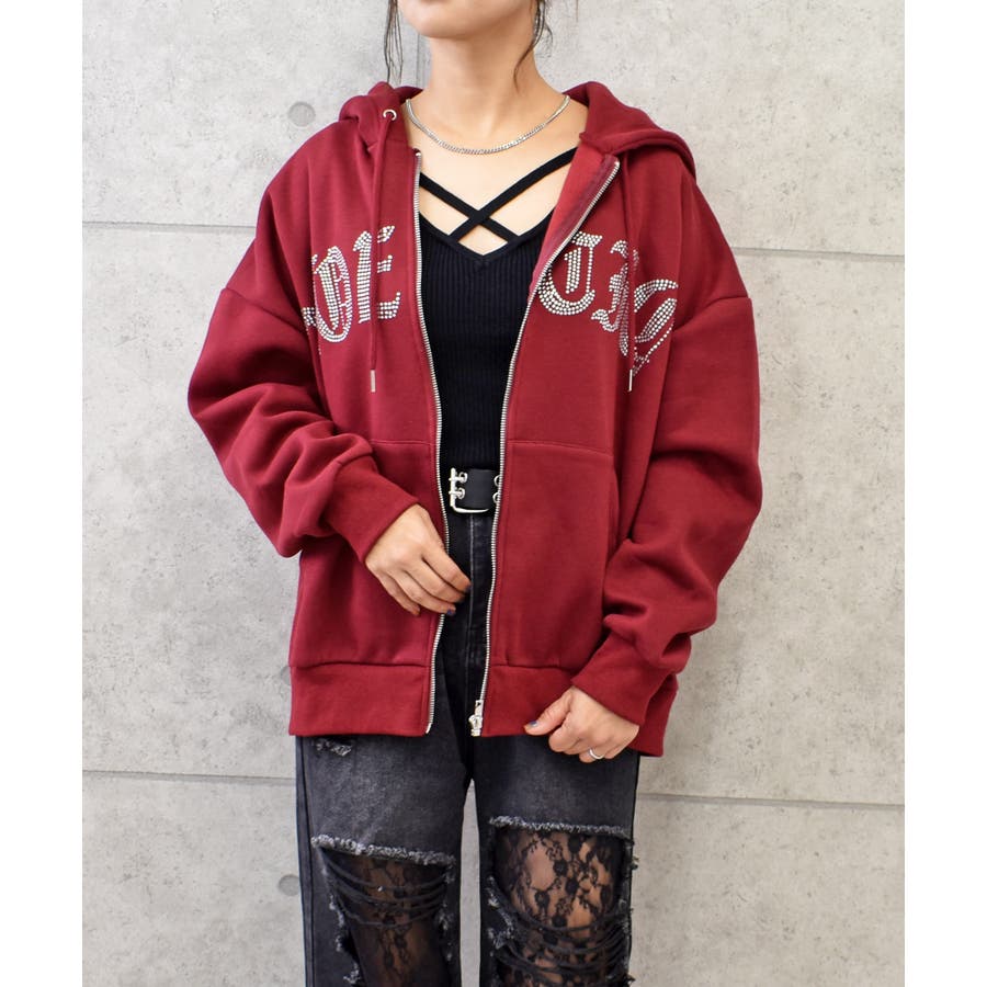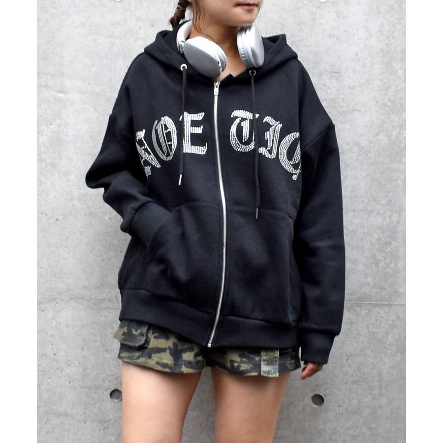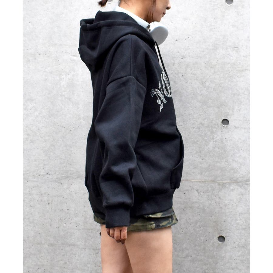 ラインストーンのロゴが、カジュアルなパーカーにキラキラとした華やかさをプラス。