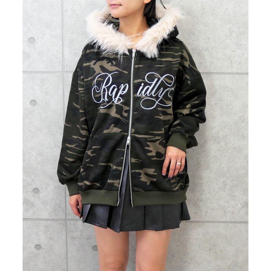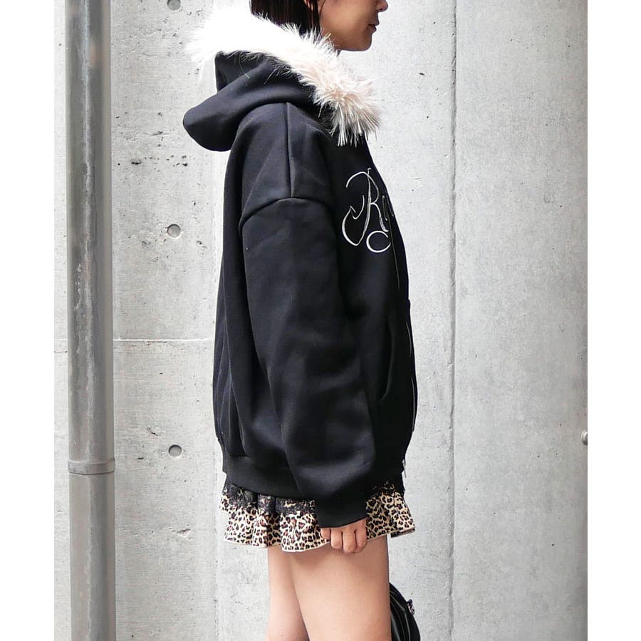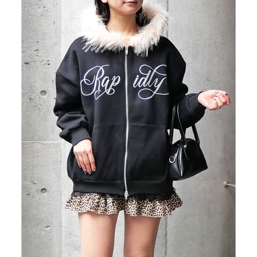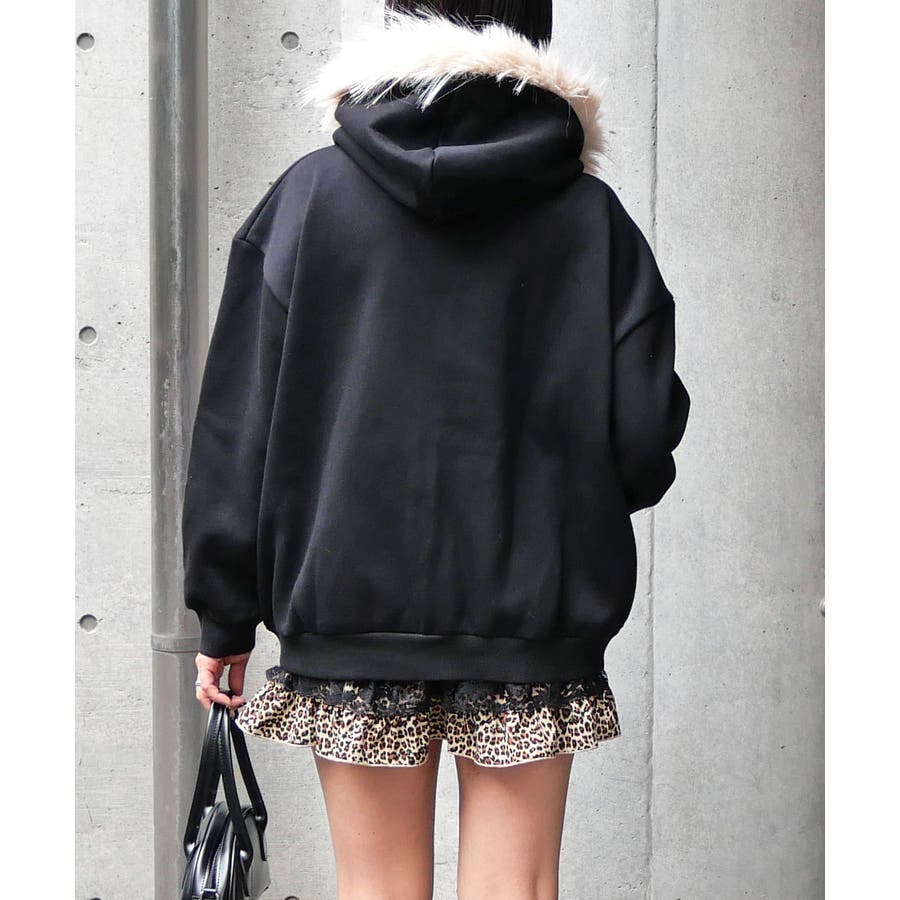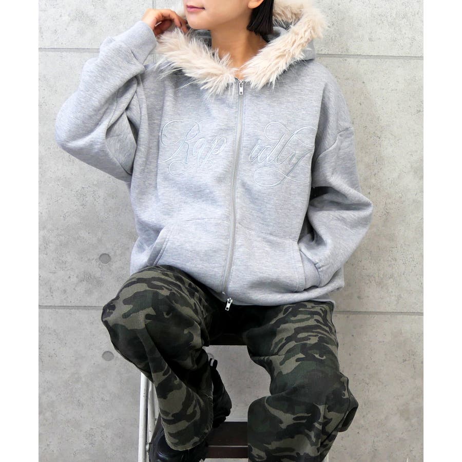 フード周りのボリュームファーが季節感を高め、小顔効果も期待できる華やかなジップパーカー。