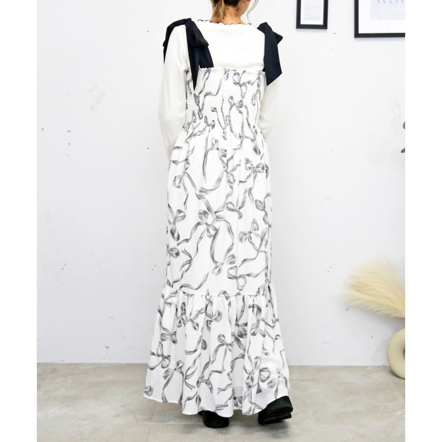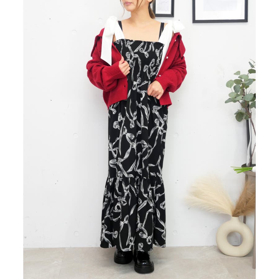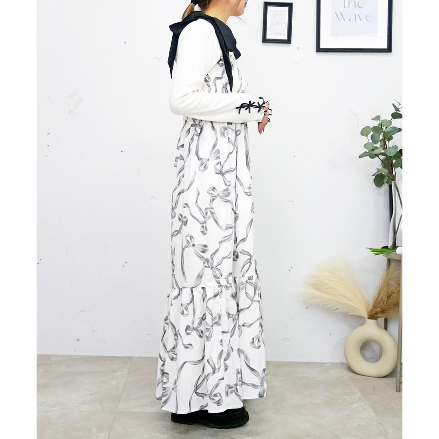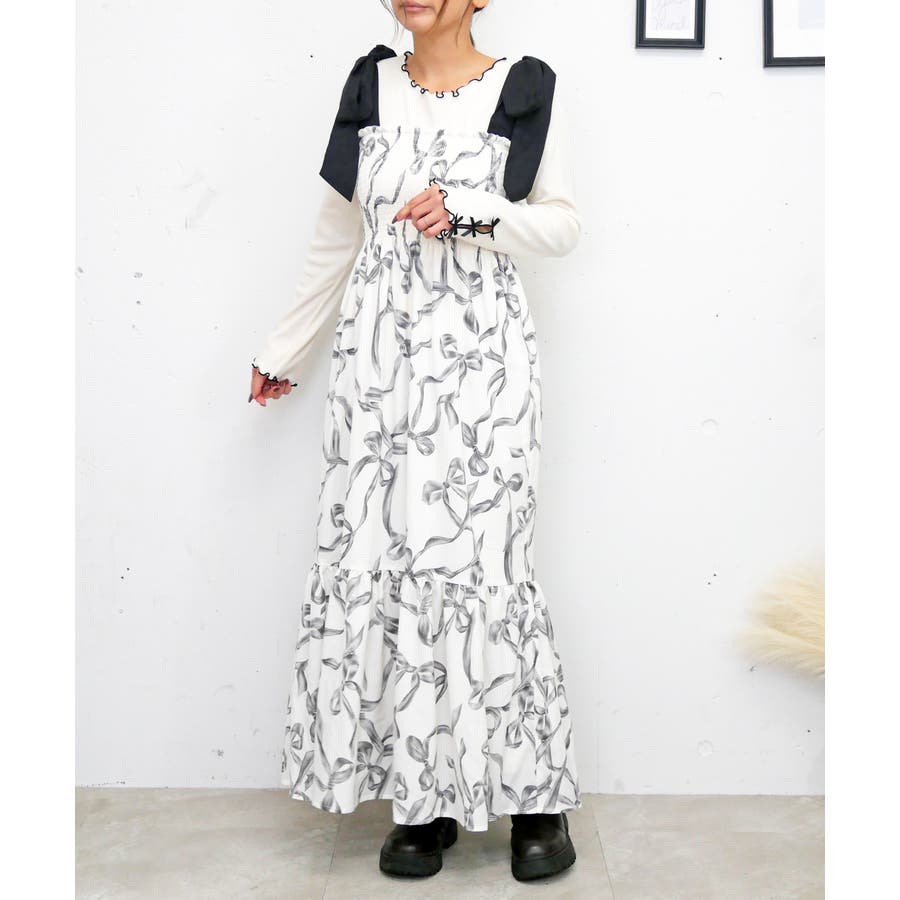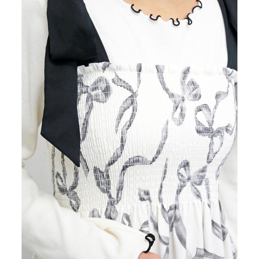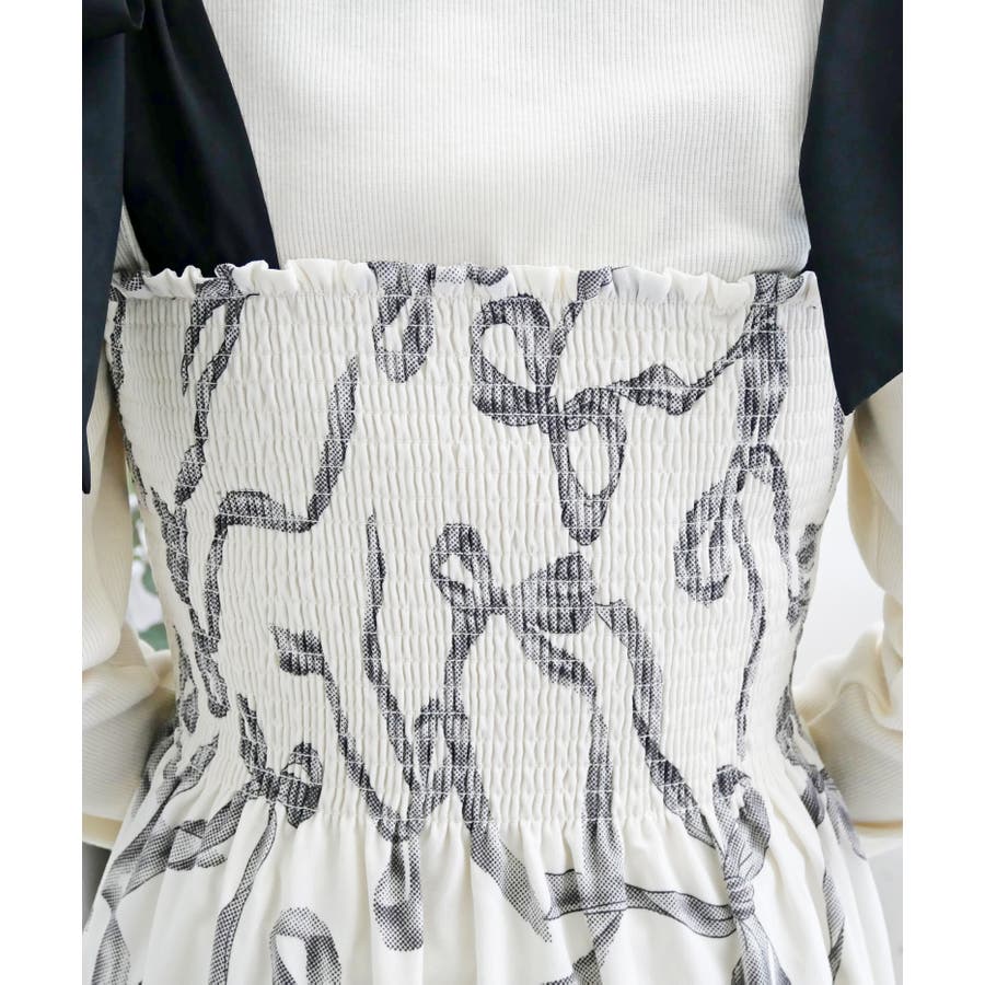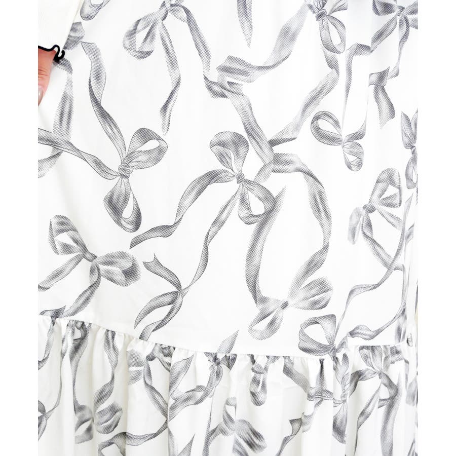 全体に散りばめられたリボン柄が、可愛らしくフェミニンな雰囲気を演出するワンピース。